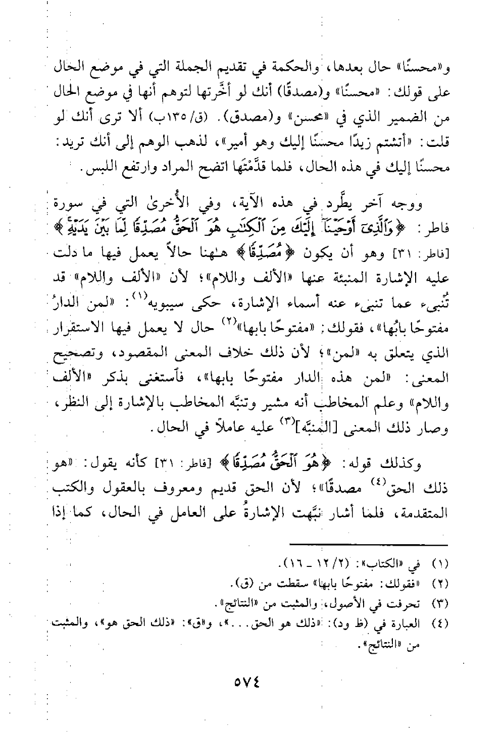 ووجه آخر يطرد في هذه الآية وفي الآية التي في سورة فاطر والذي أوحينا إليك من الكتاب هو الحق مصدقا لما بين يديه فاطر 3 وهو أن يكون مصدقا ههنا حالا يعمل فيها ما دلت عليه الإشارة المنبئة عنها الألف واللام لأن الألف واللام قد تنبيء عما تنبيء عنه أسماء الإشارة
