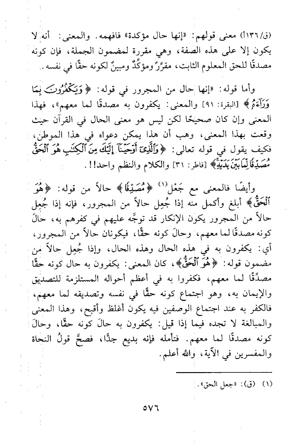 وأما قوله إنها حال من المجرور في قوله ويكفرون بما وراءه والمعنى يكفرون به مصدقا لما معهم فهذا المعنى وإن كان صحيحا لكن ليس هو معنى الحال في القرآن حيث وقعت بهذا المعنى وهب أن هذا يمكن دعواه في هذا الموطن فكيف يقول في قوله تعالى والذي أوحينا إليك من الكتاب هو الحق مصدقا لما بين يديه والكلام والنظم واحد