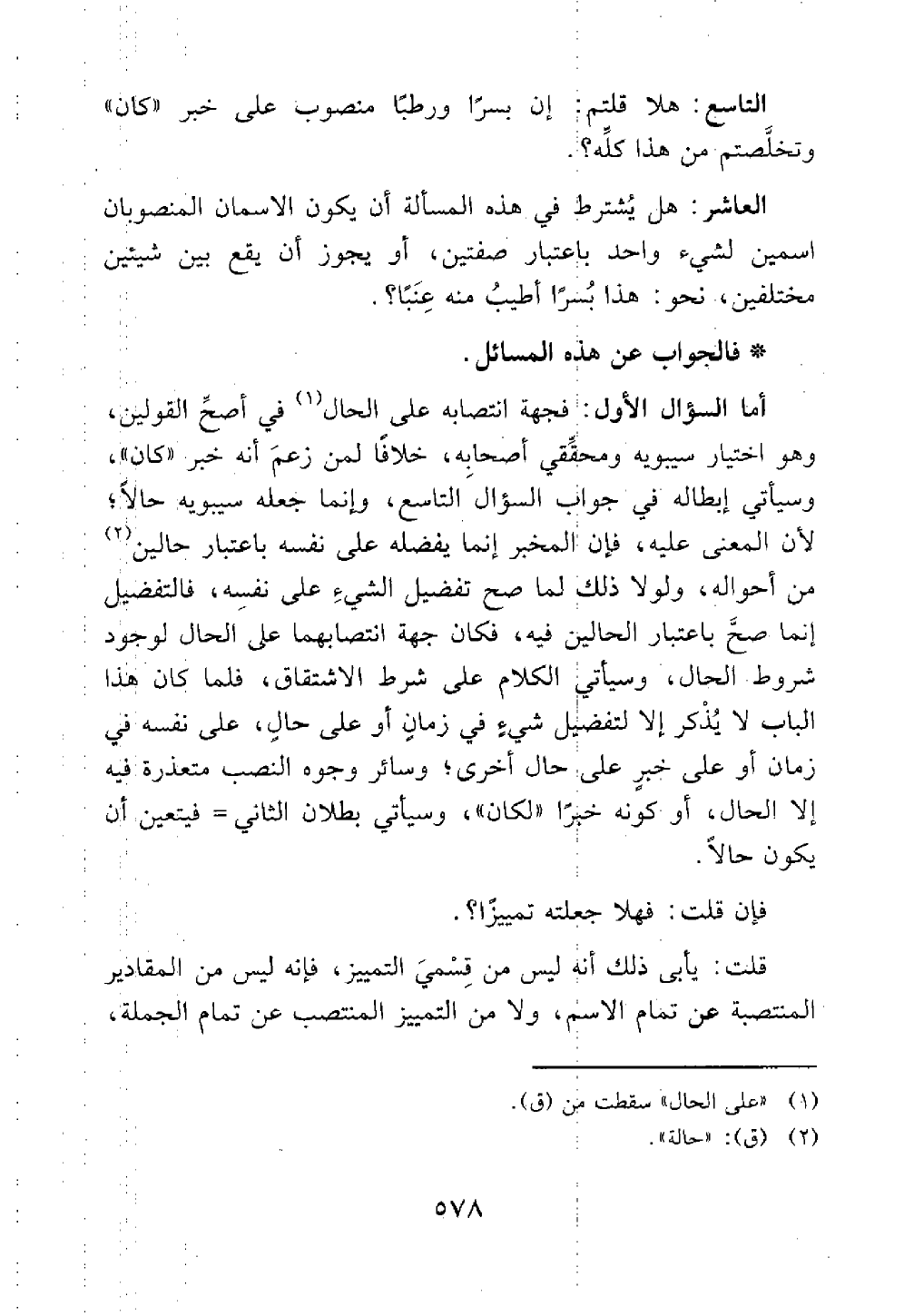 أما السؤال الأول فجهة انتصابه على الحال في أصح القولين وهو اختيار سيبويه ومحققي أصحابه خلافا لمن زعم أنه خبر كان وسيأتي إبطاله في جواب السؤال التاسع وإنما جعله سيبويه حالا لأن المعنى عليه فإن المخبر إنما يفضله على نفسه باعتبار حالين من أحواله