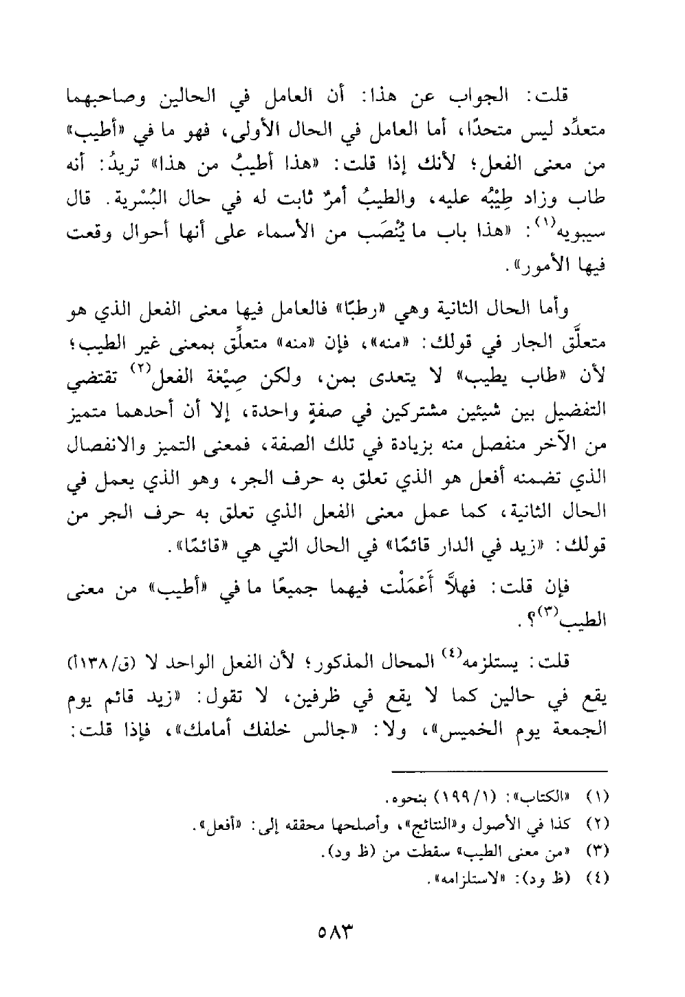 قلت الجواب عن هذا أن العامل في الحالين وصاحبهما متعدد ليس متحدا أما العامل في الحال الأولى فهو ما في أطيب من معنى الفعل لأنك إذا قلت