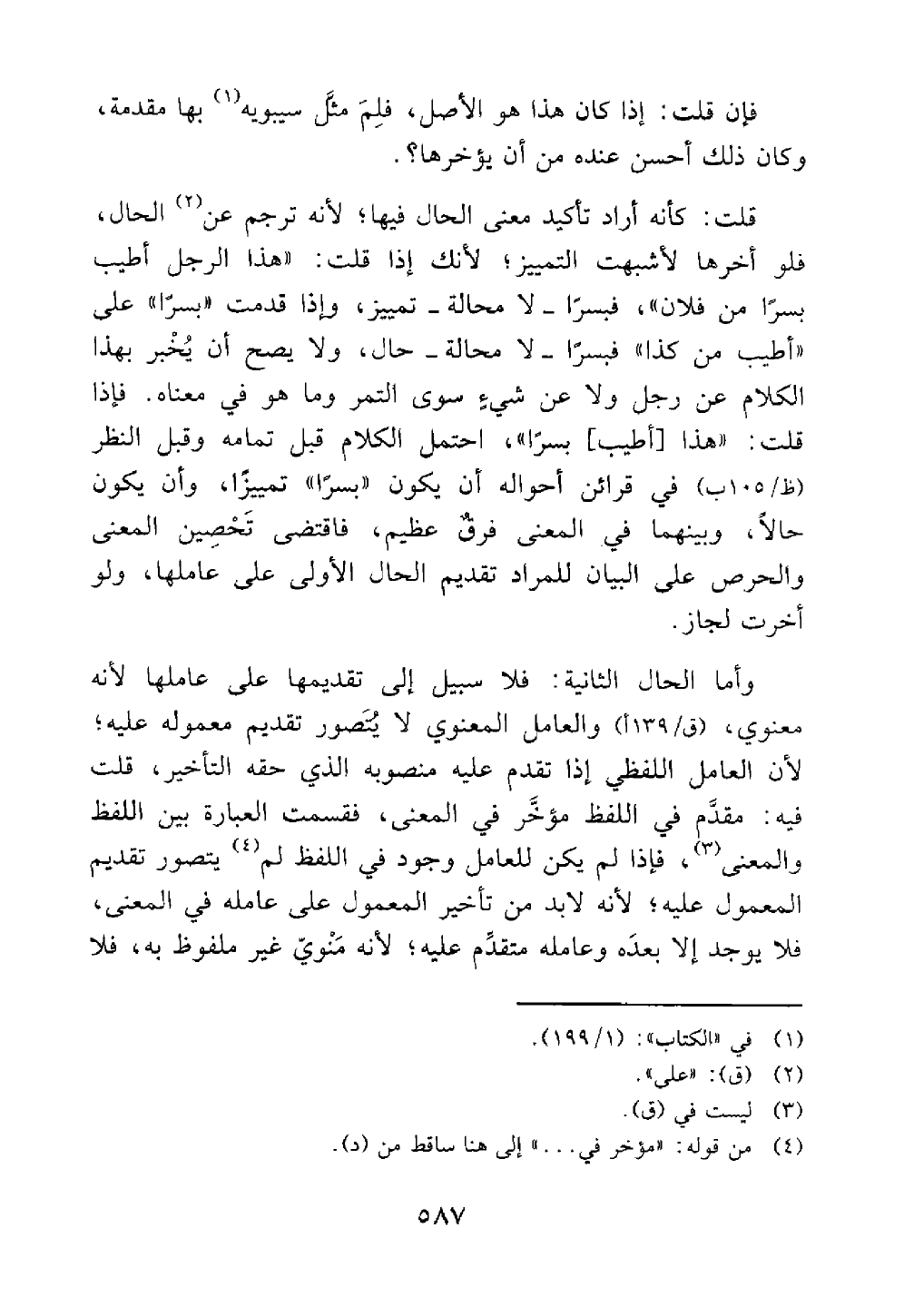 فإن قلت إذا كان هذا هو الأصل فلم مثل سيبويه بها مقدمة وكان ذلك أحسن عنده من أن يؤخرها