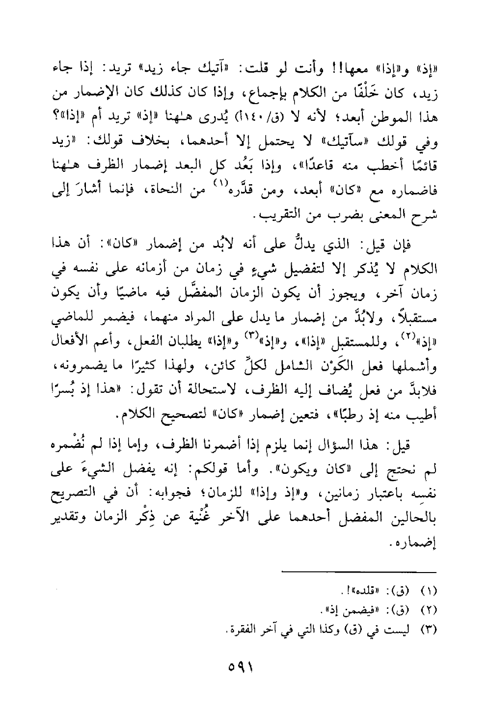 وفي قولك سآتيك لا يحتمل إلى أحدهما بخلاف قولك زيد قائما أخطب منه قاعدا وإذا بعد كل البعد إضمار الظرف ههنا فإضماره مع كان أبعد ومن قدره من النحاة فإنما أشار إلى شرح المعنى بضرب من التقريب