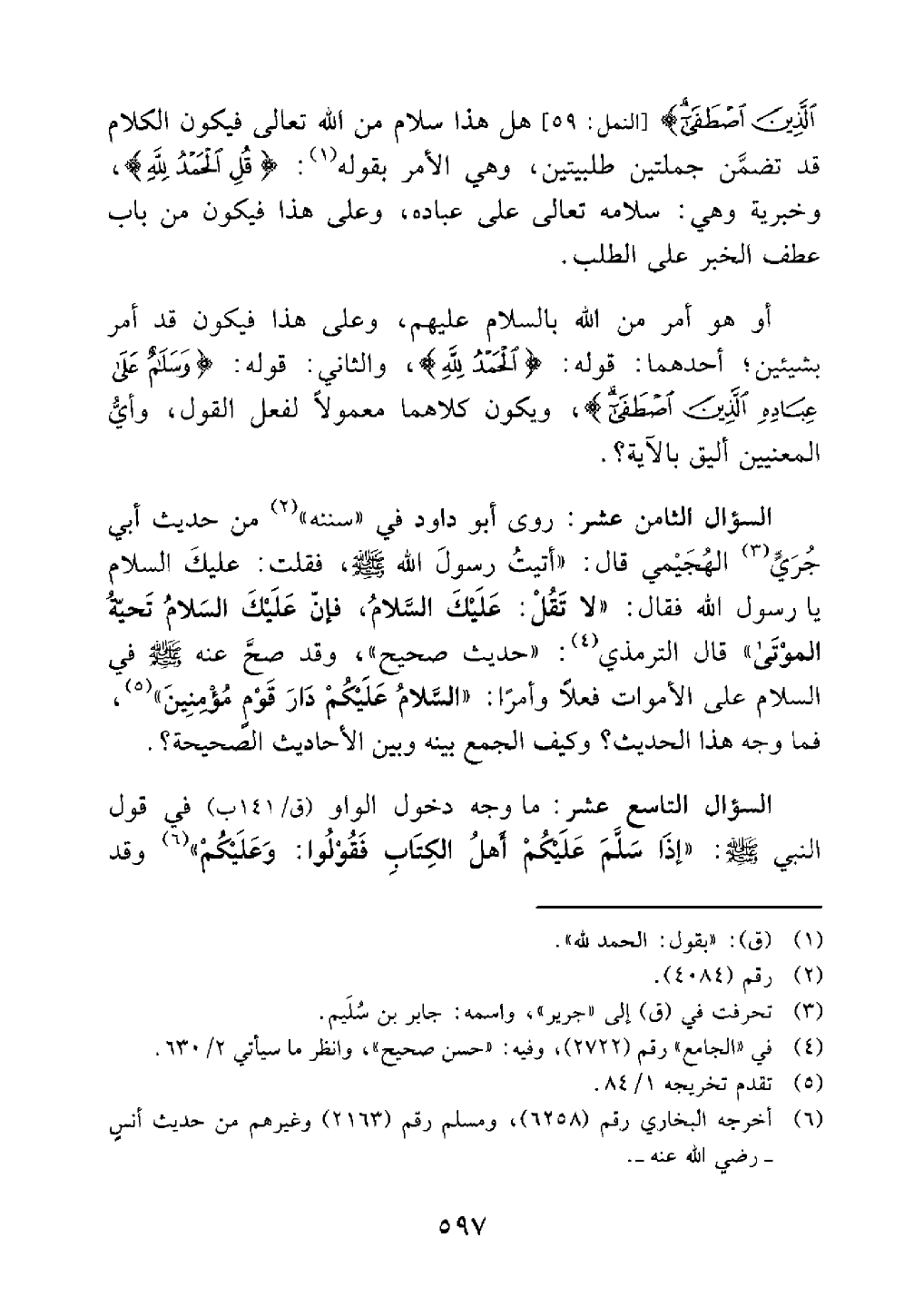 الذين اصطفى النحل 59 هل هذا سلام من الله فيكون الكلام قد تضمن جملتين طلبية وهي الأمر بقوله قل الحمد لله وخبرية وهي سلامة تعالى على عباده وعلي هذا فيكون من باب عطف الخبر على الطلب أو هو أمر من الله بالسلام عليهم وعلى هذا فيكون قد أمر بشيئين أحدهما قول الحمد لله والثاني قول سلام على عباده الذين اصطفى ويكون كلاهما معمولا لفعل القول وأي المعنيين أليق بالآية