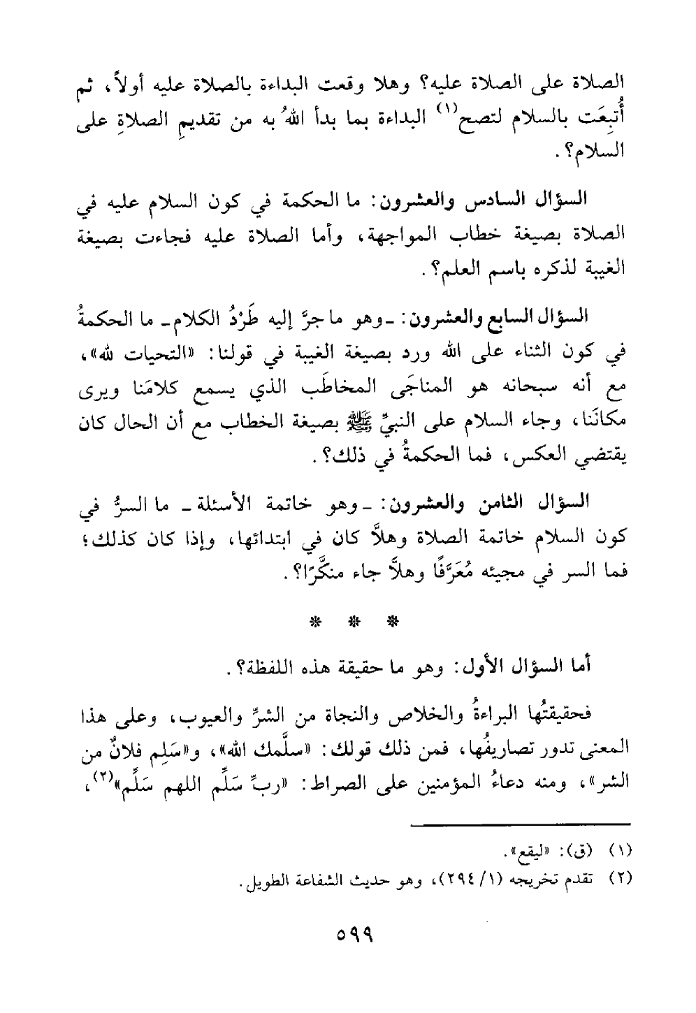 السؤال السادس والعشرون ما الحكمة في كون السلام عليه في الصلاة بصيغة خطاب المواجهة وأما الصلاة عليه فجاءت بصيغة الغيبة لذكره باسم العلم