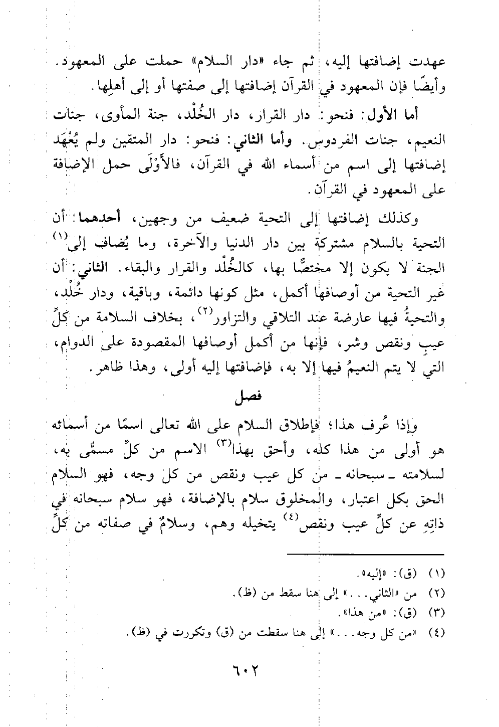 أما الأول فنحو دار القرار دار المجد جنة المأوى جنات النعيم جنات الفردوس وأما الثاني فنحو دار المتقين ولم تعهد إضافتها إلى اسم من أسماء الله تعالى في القرآن فالأولى حمل الإضافة على المعهود في القرآن وكذلك إضافتها إلى التحية ضعيف من وجهين