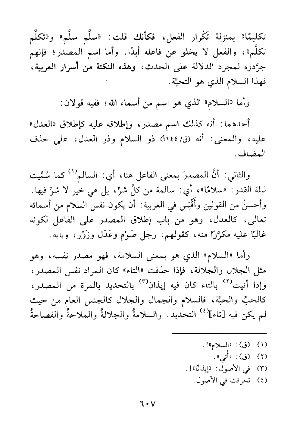 وأما السلام الذي هو بمعنى السلامة فهو مصدر نفسه وهو مثل الجلال والجلالة فإذا حذفت التاء كان المراد نفس المصدر وإذا أتيت بالثاء كان فيه إيذان بالتحديد بالمرة من المصدر كالحب والحبة فالسلام والجمال والجلال كالجنس العام من حيث لم يكن فيه تاء التحديد والسلامة والجلالة والملاحة والفصاحة@
