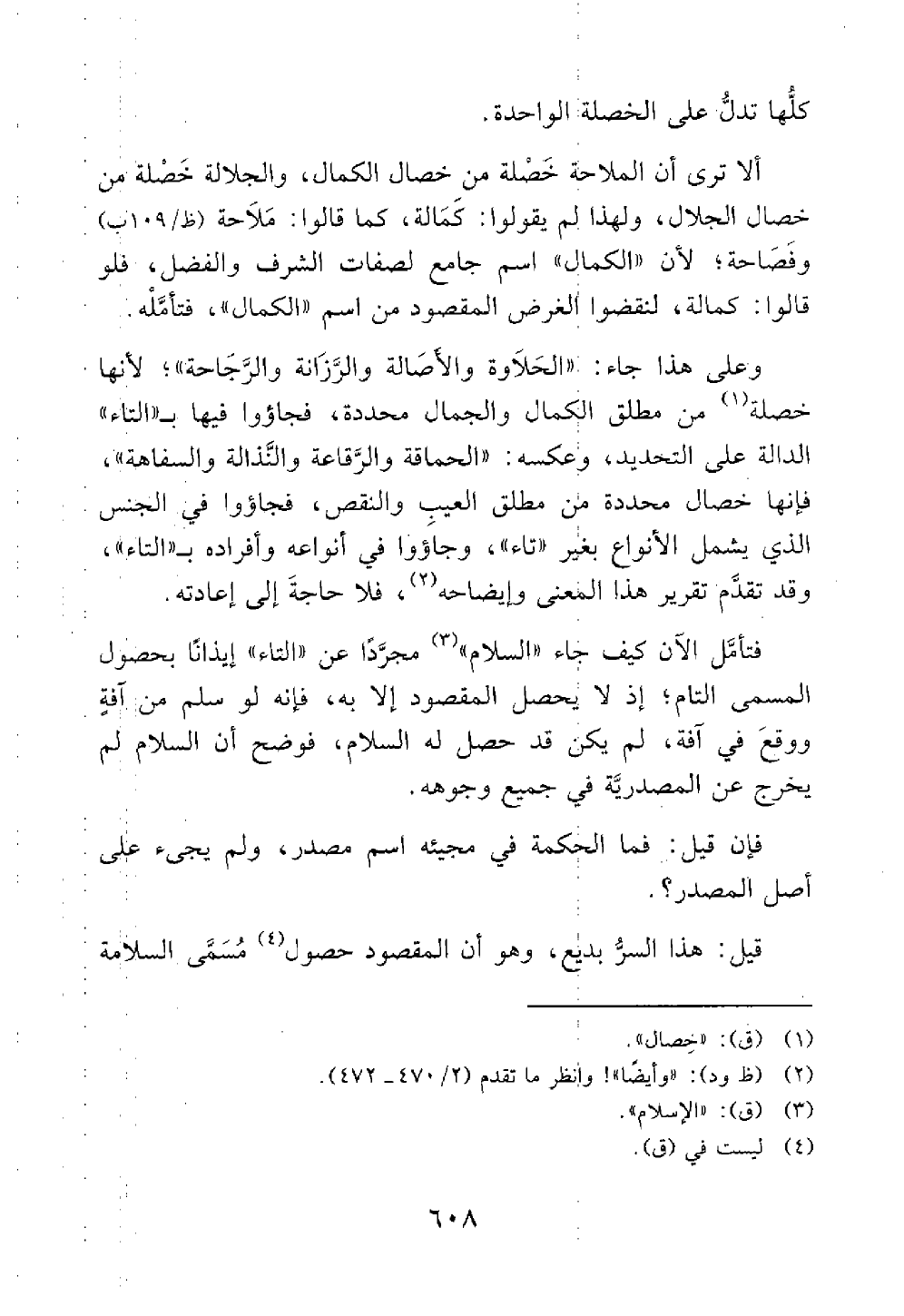 ألا ترى أن الملاحة خصلة من خصال الكمال والجلالة من خصال الجلال ولهذا لم يقولوا كمالة كما قالوا ملاحة وفصاحة لأن الكمال اسم جامع لصفات الشرف والفضل فلو قالوا كمالة لنقضوا الغرض المقصود من اسم الكمال فتأمله