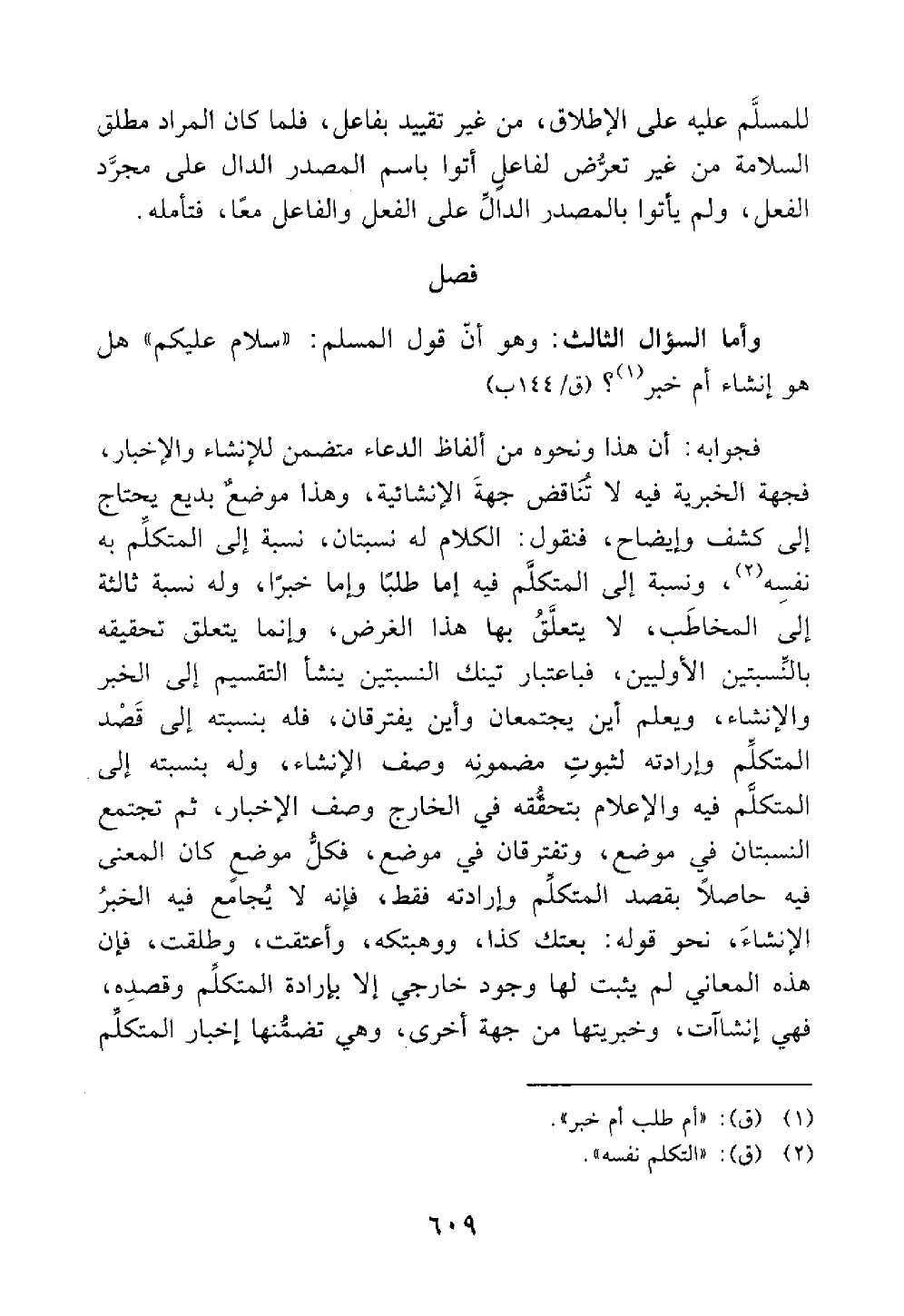 وأما السؤال الثالث وهو أن قول المسلم سلام عليكم هل هو إنشاء أم خبر فجوابه أن هذا ونحوه من ألفاظ الدعاء متضمن للإنشاء والإخبار فجهة الخبرية فيه لا تناقض جهة الإنشائية وهذا موضع بديع يحتاج إلى كشف وإيضاح فنقول