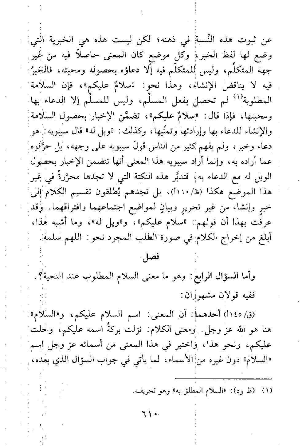 وقد عرفت بهذا أن قولهم سلام عليكم وويل له وما أشبه هذا أبلغ من إخراج الكلام في صورة الطلب المجرد نحو اللهم سلمه فصل معنى السلام المطلوب عند التحية
