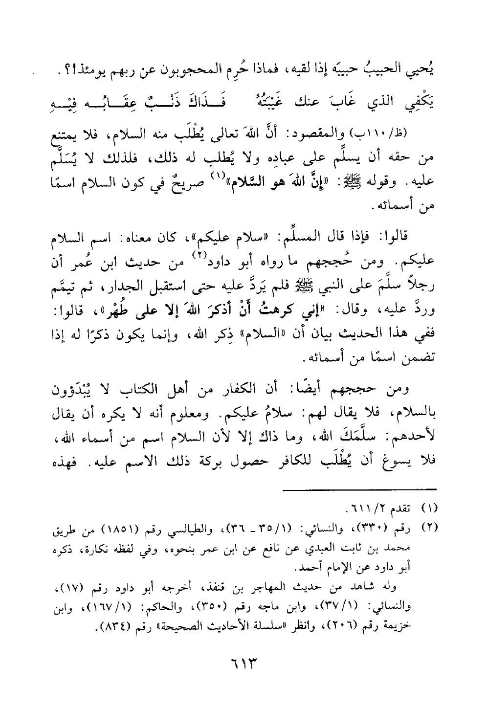 ومن حججهم أيضا أن الكفار من أهل الكتاب لا يبدؤون بالسلام فلا يقال لهم سلام عليكم ومعلوم أنه لا يكره أن يقال لأحدهم سلمك الله وما ذاك إلا أن السلام اسم من أسماء الله فلا يسوغ أن يطلب للكافر حصول بركة ذلك الإسم عليه فهذه @