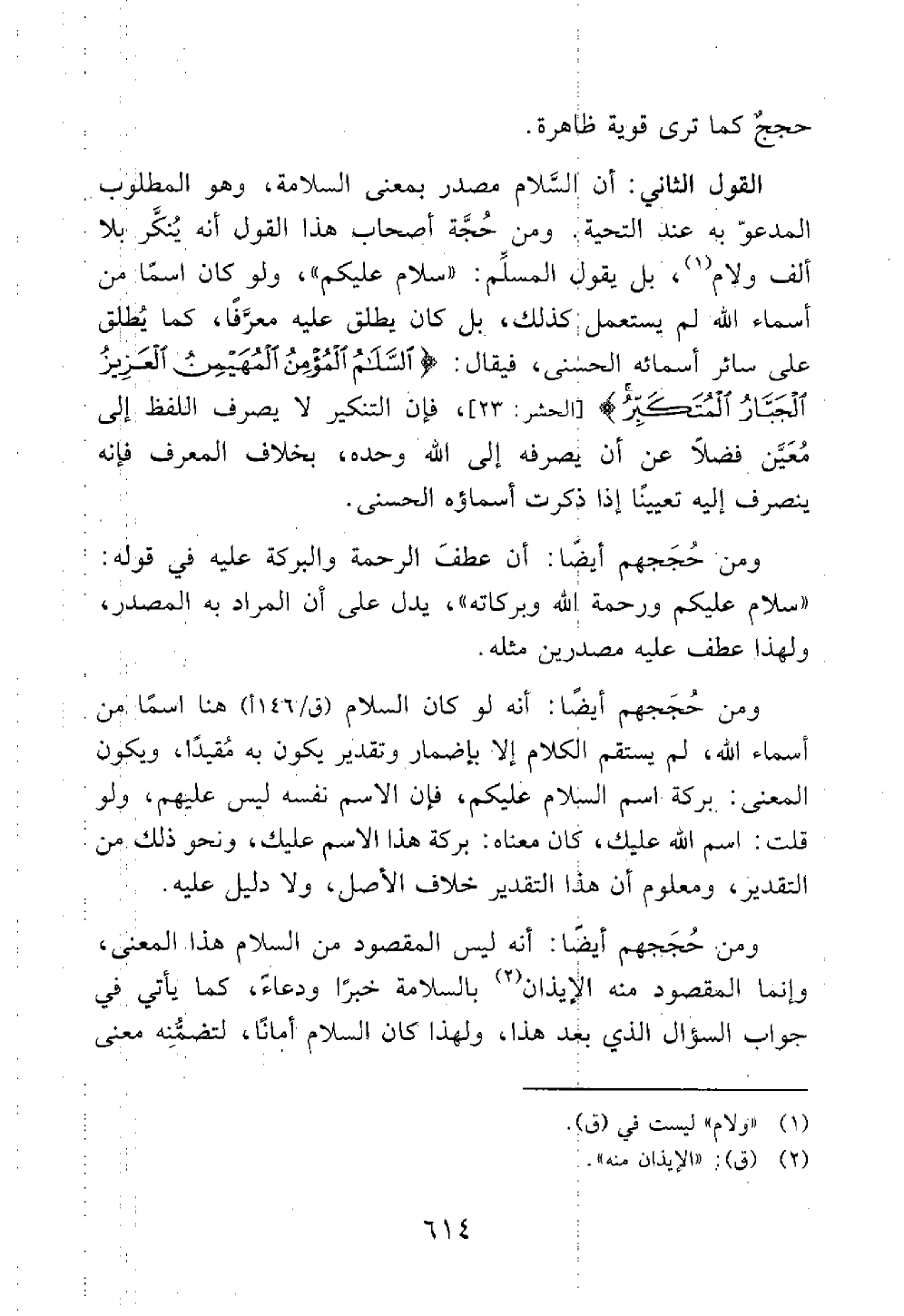ومن حجة أصحاب هذا القول أنه يذكر بلا ألف ولام بل يقول المسلم سلام عليكم ولو كان اسما من أسماء الله لم يستعمل كذلك بل كان يطلق عليه معرفة كما يطلق عليه سائر أسمائه الحسنى فيقال السلام المؤمن المهيمن العزيز الجبار المتكبر الحشر 23 فإن التنكير لا يصرف اللفظ إلى معين فضلا عن أن يصرفه إلى الله وحده بخلاف المعرف فإنه ينصرف إليه تعيينا إذا ذكرت أسماؤه الحسنى