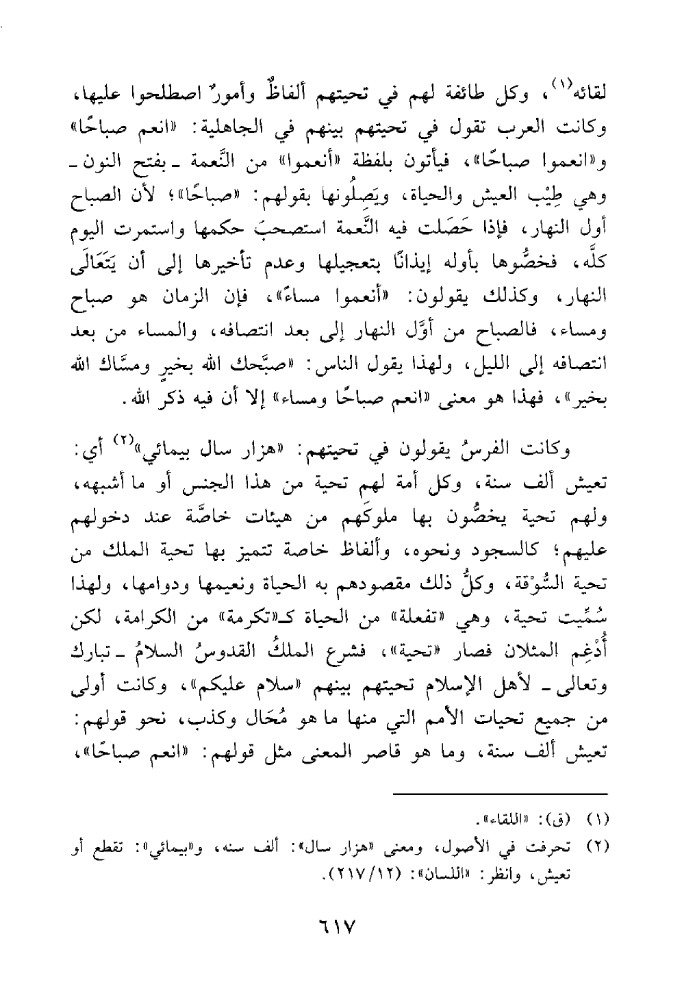 وكانت العرب تقول في تحيتهم بينهم في الجاهلية أنعم صباحا وأنعموا صباحا فيأتون بلفظة أنعموا من النعمة بفتح النون وهي طيب العيش والحياة ويصلونها بقولهم صباحا لأن الصباح في أول النهار فإذا حصلت فيه النعمة استصحب حكمها واستمرت اليوم كله فخصوها بأوله إيذانا بتعجيلها وعدم تأخرها إلى أن يتعالى النهار