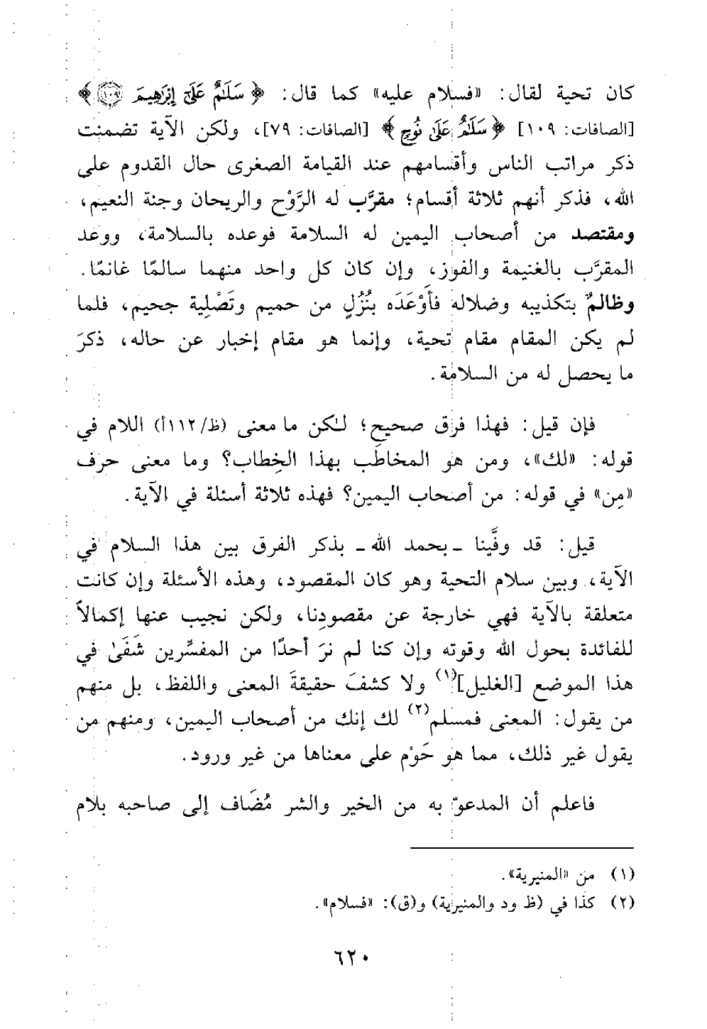قيل قد وفينا بحمد الله تعالى بذكر الفرق بين هذا السلام في الآية وبين سلام التحية وهو الذي كان المقصود وهذه الأسئلة وإن كانت متعلقة بالآية فهي خارجة عن مقصودنا ولكن نجيب عنها إكمالا للفائدة بحول الله وقوته وإن كنا لم نر أحدا من المفسرين شفى في هذا الموضع الغليل ولا كشف حقيقة المعنى واللفظ بل منهم من يقول المعنى فمسلم لك إنك من أصحاب اليمين ومنهم من يقول غير ذلك مما هو حوم على معناها من غير ورود فأعلم أن المدعو به من الخير والشر مضاف إلى صاحبه بلام @