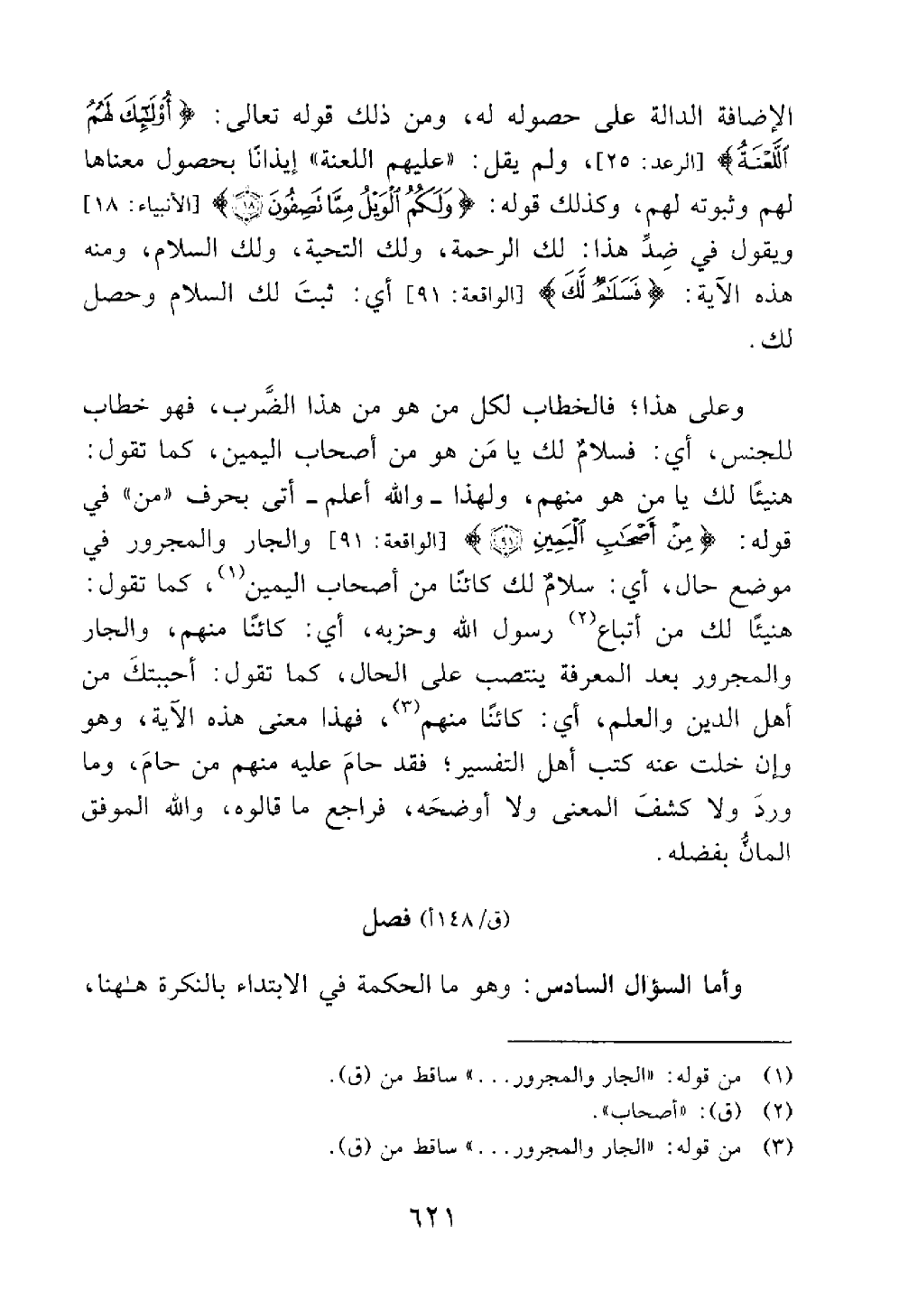 وعلى هذا فالخطاب لكل من هو من هذا الضرب فهو خطاب للجنس أي فسلام لك يا من هو من أصحاب اليمين كما تقول هنيئا لك يا من هو منهم ولهذا والله أعلم أتى بحرف من في قوله من أصحاب اليمين والجار والمجرور في موضع حال أي سلام لك كائنا من أصحاب اليمين كما تقول هنيئا لك من اتباع رسول الله وحزبه أي كائنا منهم والجار والمجرور بعد المعرفة ينتصب على الحال كما تقول أحببتك من أهل الدين والعلم أي كائنا منهم فهذا معنى هذه الآية وهو وإن خلت عنه كتب أهل التفسير فقد حام عليه منهم من حام وما ورد ولا كشف المعنى ولا أوضحه فراجع ما قالوه والله تعالى الموفق المان بفضله