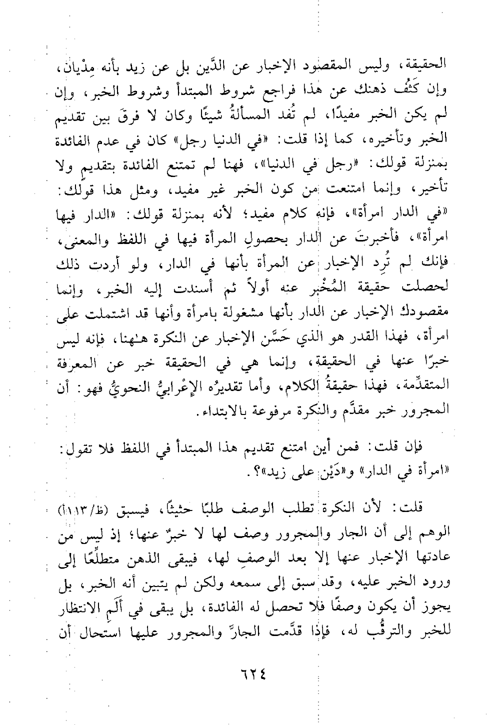 ومثل هذا قولك في الدار امرأة فإنه كلام مفيد لأنه بمنزلة قولك الدار فيها امرأة فأخبرت عن الدار بحصول المرأة فيها في اللفظ والمعنى فإنك لم ترد الإخبار عن المرأة بأنها في الدار ولو أردت ذلك لحصلت حقيقة المخبر عنه أولا ثم أسندت إليه الخبر وإنما مقصودك الإخبار عن الدار بأنها مشغولة بامرأة وأنها اشتملت على امرأة فهذا القدر هي الذي حسن الإخبار عن النكرة هاهنا فإنها ليست خبرا في الحقيقة وإنما هي في الحقيقة خبر عن المعرفة المتقدمة فهذا حقيقة الكلام وأما تقديره الإعرابي النحوي فهو أن المجرور خبر مقدم والنكرة مرفوعة بالإبتداء يشترط للإبتداء بالنكرة أن تكون موصوفة