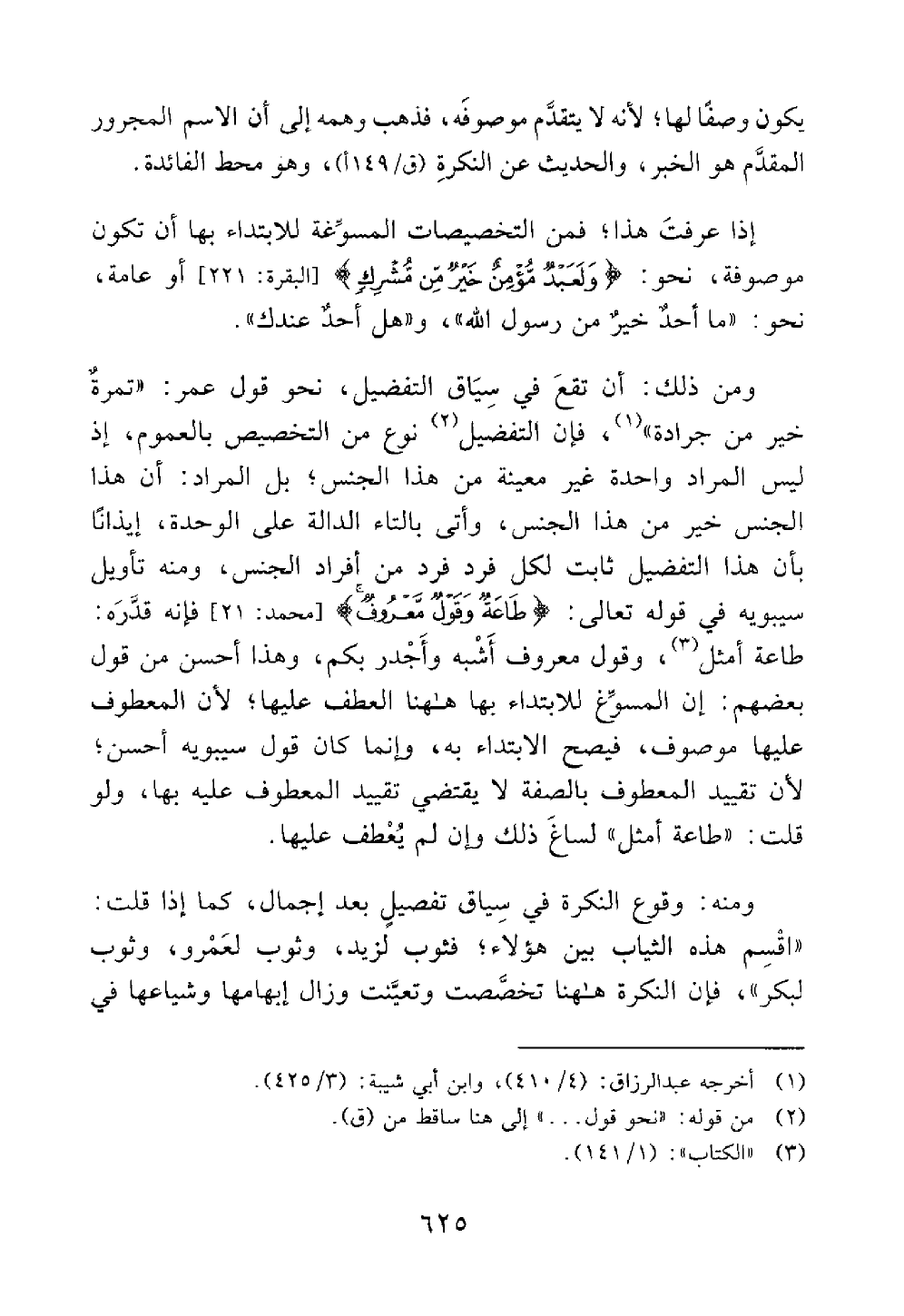 إذا عرفت هذا فمن التخصصات المسوغة للإبتداء بها أن تكون موصوفة نحو ولعبد مؤمن خير من مشرك البقرة 221 أو عامة نحو ما أحد خير من رسول الله وهل أحد عندك