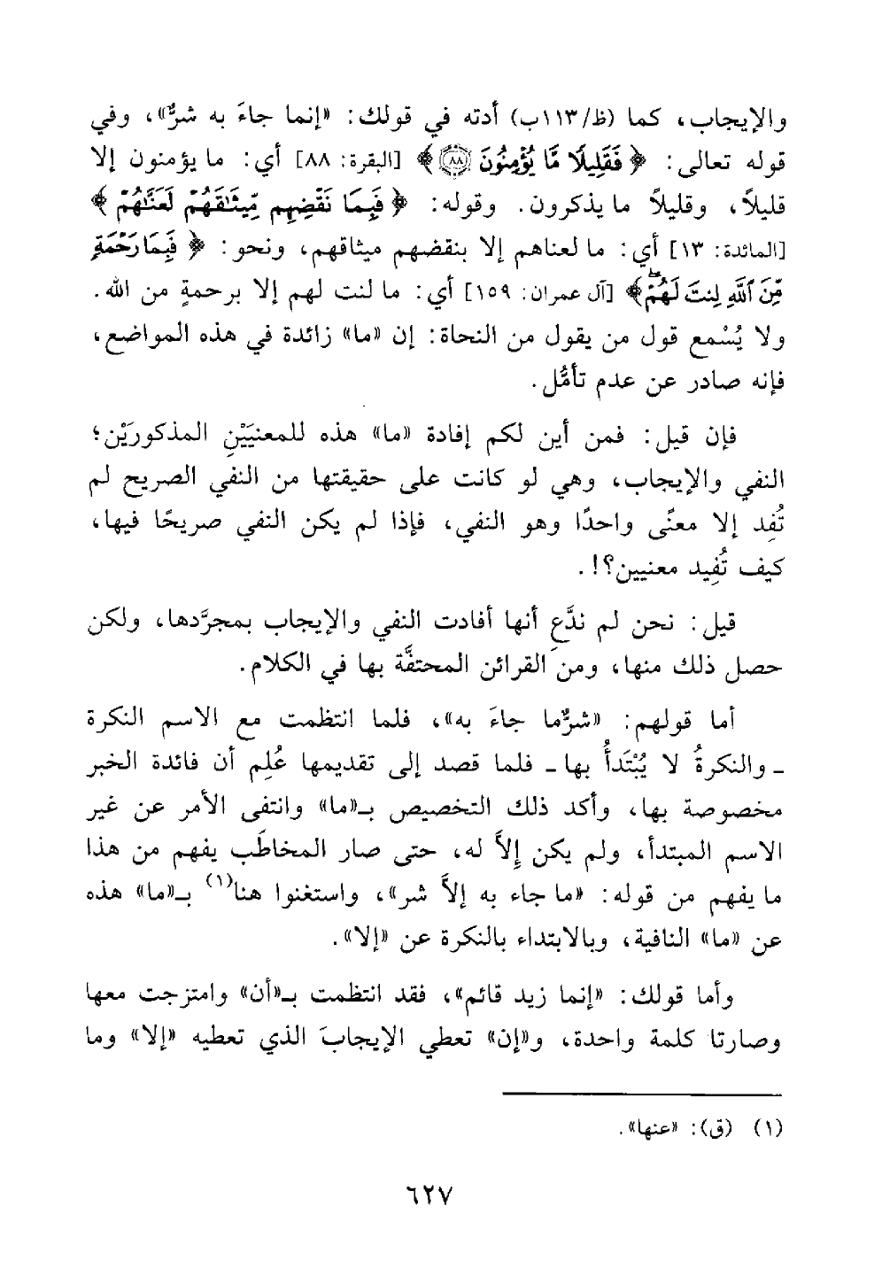 فإن قيل فمن أين لكم أفادت ما هذه المعنيين المذكورين من النفي والإيجاب وهي لو كانت على حقيقتها من النفي الصريح لم تفد إلا معنى واحد وهو النفي فإذا لم يكن النفي صريحا فيها كيف تفيد معنيين
