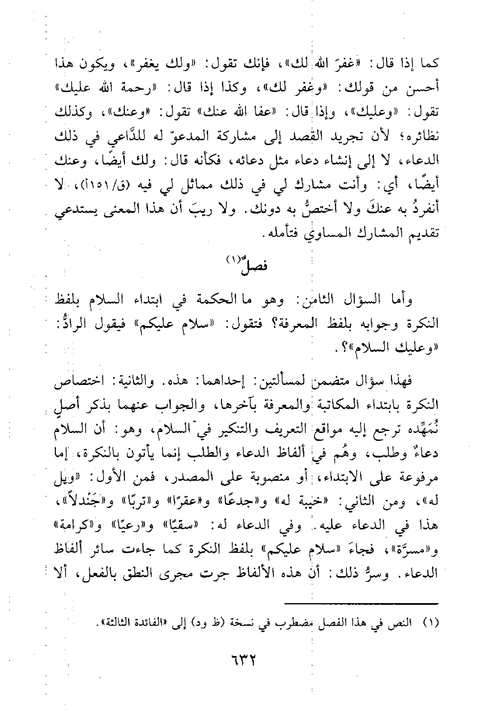 فتقول سلام عليكم فيقول الراد وعليك السلام فهذا سؤال يتضمن لمسألتين إحداهما هذه والثانية اختصاص النكرة بابتداء المكاتبة والمعرفة بآخرها والجواب عنها بذكر أصل نمهده ترجع إليه مواقع التعريف والتنكير في السلام