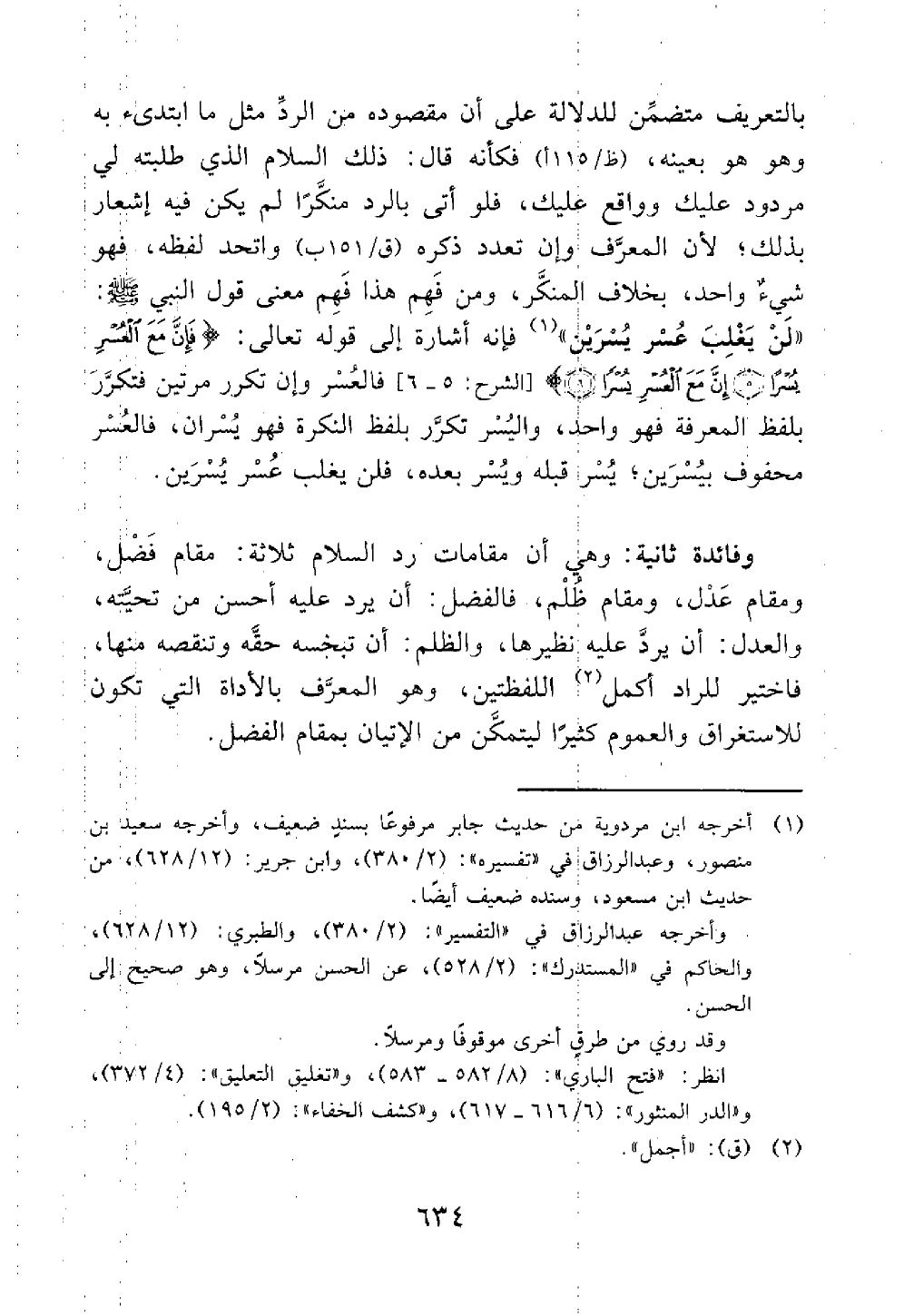 ومن فهم هذا فهم معنى قول النبي لن يغلب عسر يسرين // مرسل وله طرق تعضده // فإنه أشار إلى قوله تعالى فإن مع العسر يسرا إن مع العسر يسرا الشرح 5 6 فالعسر وإن تكرر مرتين فتكرر بلفظ المعرفة فهو واحد واليسر تكرر بلفظ النكرة فهو يسران فالعسر محفوف بيسرين يسر قبله ويسر بعده فلن يغلب عسر يسرين