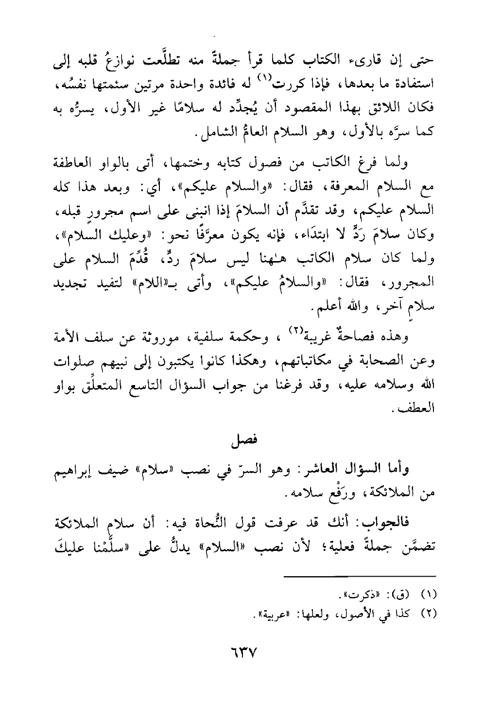 حتى أن قارىء الكتاب كلما قرأ جمله منها لفائدة غير الفائدة المتقدمة تطلعت نوازع قلبه إلى استفادة ما بعدها فإذا كررت له فائدة واحدة مرتين سئمتها نفسه فكان اللائق بهذا المقصود أن يجدد له سلاما غير الأول يسره به كما سره بالأول وهو السلام العام الشامل
