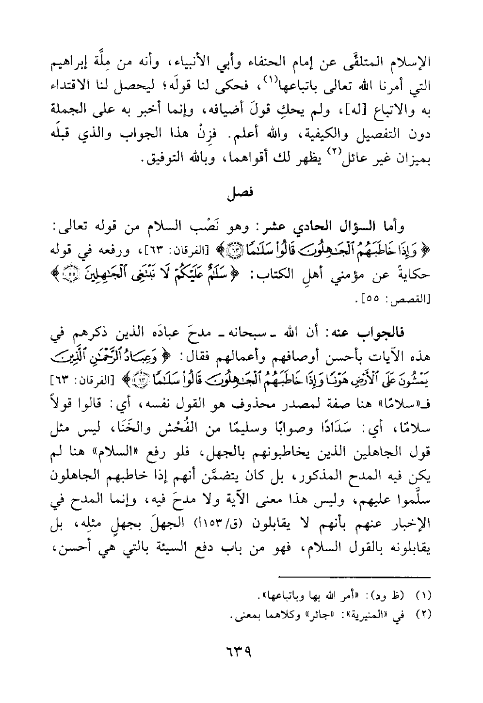 وأما السؤال الحادي عشر وهو نصب السلام من قوله تعالى وإذا خاطبهم الجاهلون قالوا سلاما ورفعه في قوله حكاية عن مؤمني أهل الكتاب سلام عليكم لا نبتغي الجاهلين القصص 55