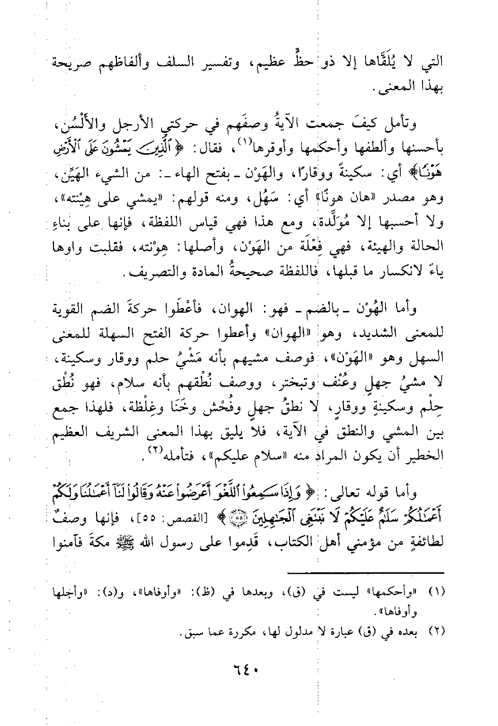 حركتي الأرجل والألسن بأحسنها وألطفها وأحكمها وأوقرها فقال الذين يمشون على الأرض هونا أي بسكينة ووقار والهون بفتح الهاء من الشيء وهو مصدر هان هونا أي سهل ومنه قولهم يمشي على هينته ولا أحسبها إلا مولدة ومع هذا فهي قياس اللفظة فإنها على بناء الحالة والهيئة فهي فعلة من الهون وأصلها هونة فقلبت واوها ياء لانكسار ما قبلها فاللفظة صحيحة المادة والتصريف وأما الهون بالضم فهو الهوان فأعطوا حركة الضم القوية للمعنى الشديد وهو الهوان وأعطوا حركة الفتح السهلة للمعنى السهل وهو الهون فوصف مشيهم بأنه مشي حلم ووقار وسكينة لا مشي جهل وعنف وتبختر ووصف نطقهم بأنه سلام فهو نطق حلم وسكينة ووقار لا نطق جهل وفحش وخنا وغلظة فلهذا جمع بين المشي والنطق في الآية فلا يليق بهذا المعنى الشريف العظيم الخطير أن يكون المراد منه سلام عليكم فتأمله