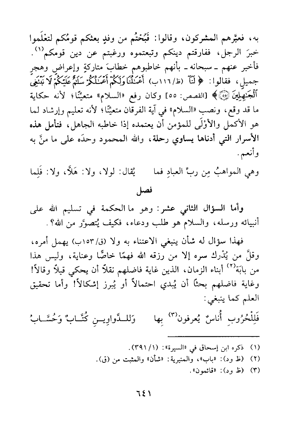 وأما السؤال الثاني عشر وهو ما الحكمة في تسليم الله على أنبيائه ورسله والسلام هو طلب ودعاء فكيف يتصور من الله فهذا سؤال له شأن ينبغي الإعتناء به ولا يهمل أمره وقل من يدرك سره إلا من رزقه الله فهما خاصا وعناية وليس هذا من شأن أبناء الزمان الذين غاية فاضلهم نقلا أن يحكي قيلا وقالا وغاية فاضلهم بحثا أن يبدي احتمالا ويبرز إشكالا وأما تحقيق العلم كما ينبغي