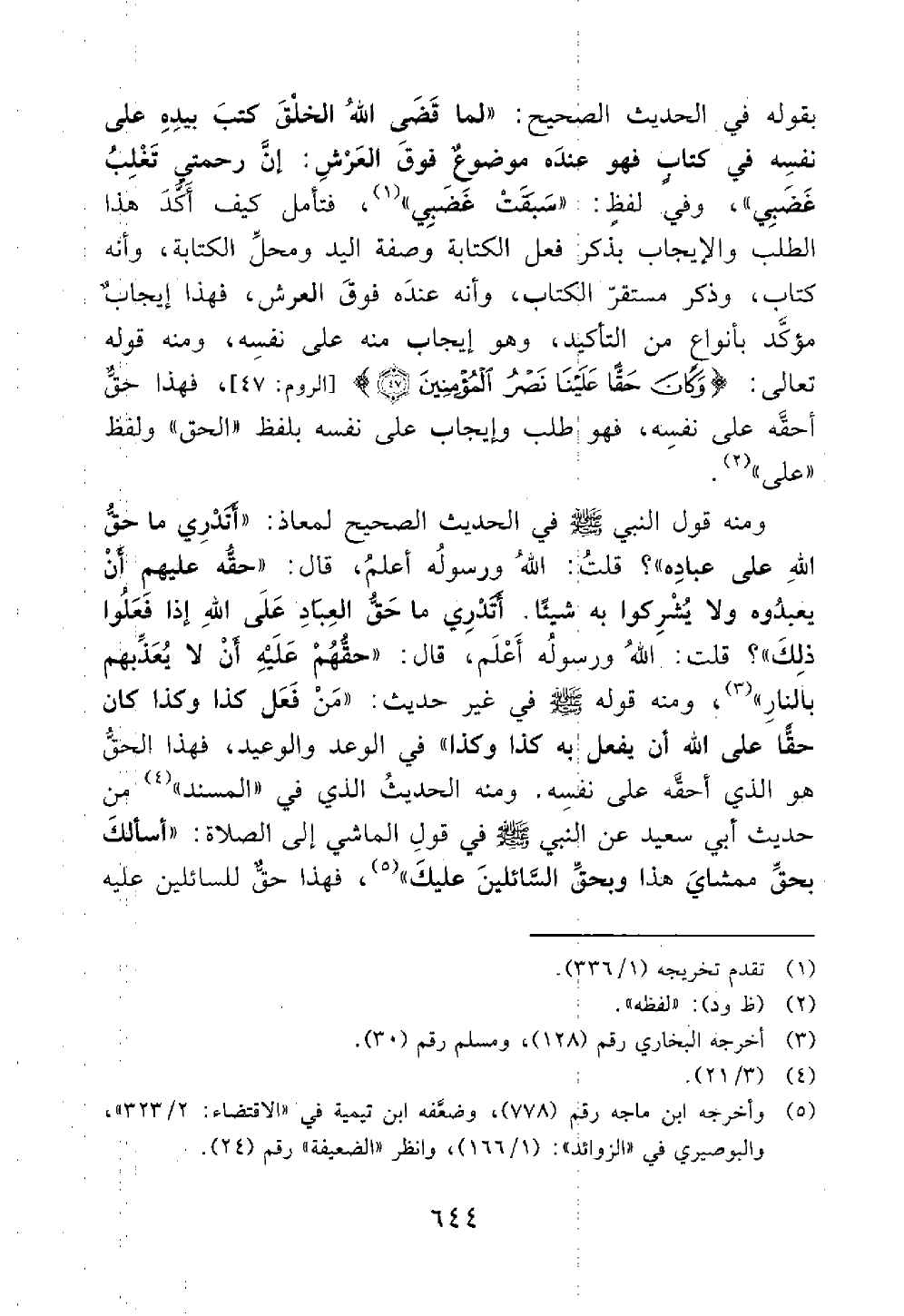 ومنه قول النبي في الحديث الصحيح لمعاذ أتدري ما حق الله على عباده قلت الله ورسوله أعلم قال حقه عليهم أن يعبدوه ولا يشركوا به شيئا أتدري ما حق العباد على الله إذا فعلوا ذلك قلت الله ورسوله أعلم قال حقهم عليه أن لا يعذبهم بالنار // رواه البخاري ومسلم //