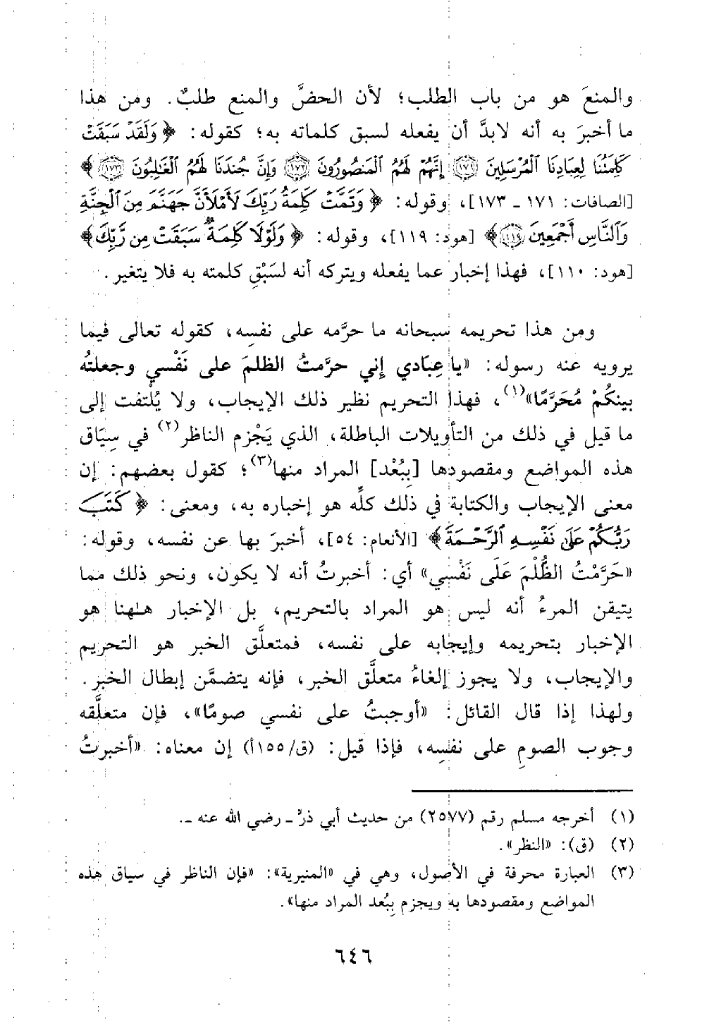 ومن هذا تحريمه سبحانه ما حرمه على نفسه كقوله فيما يرويه عن رسوله يا عبادي إني حرمت الظلم على نفسي وجعلته بينكم محرما // رواه مسلم والترمذي // فهذا التحريم نظير ذلك الإيجاب ولا يلتفت إلى ما قيل في ذلك من التأويلات الباطلة فإن الناظر في سياق هذه المواضع ومقصودها به يجزم ببعد المراد منها كقول بعضهم إن معنى الإيجاب والكتاب في ذلك كله هو إخباره به ومعنى كتب ربكم