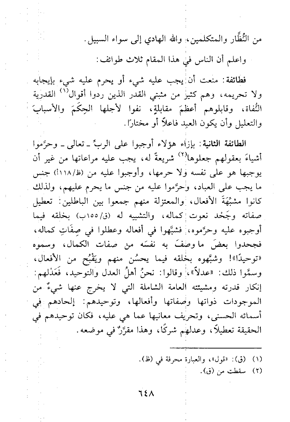 الطائفة الثانية بإزاء هؤلاء أوجبوا على الرب وحرموا أشياء بعقولهم جعلوها شريعة له يجب عليه مراعاتها من غير أن يوجبها هو على نفسه ولا حرمها وأوجبوا عليه من جنس ما يجب على العباد وحرموا عليه من جنس ما يحرم عليهم ولذلك