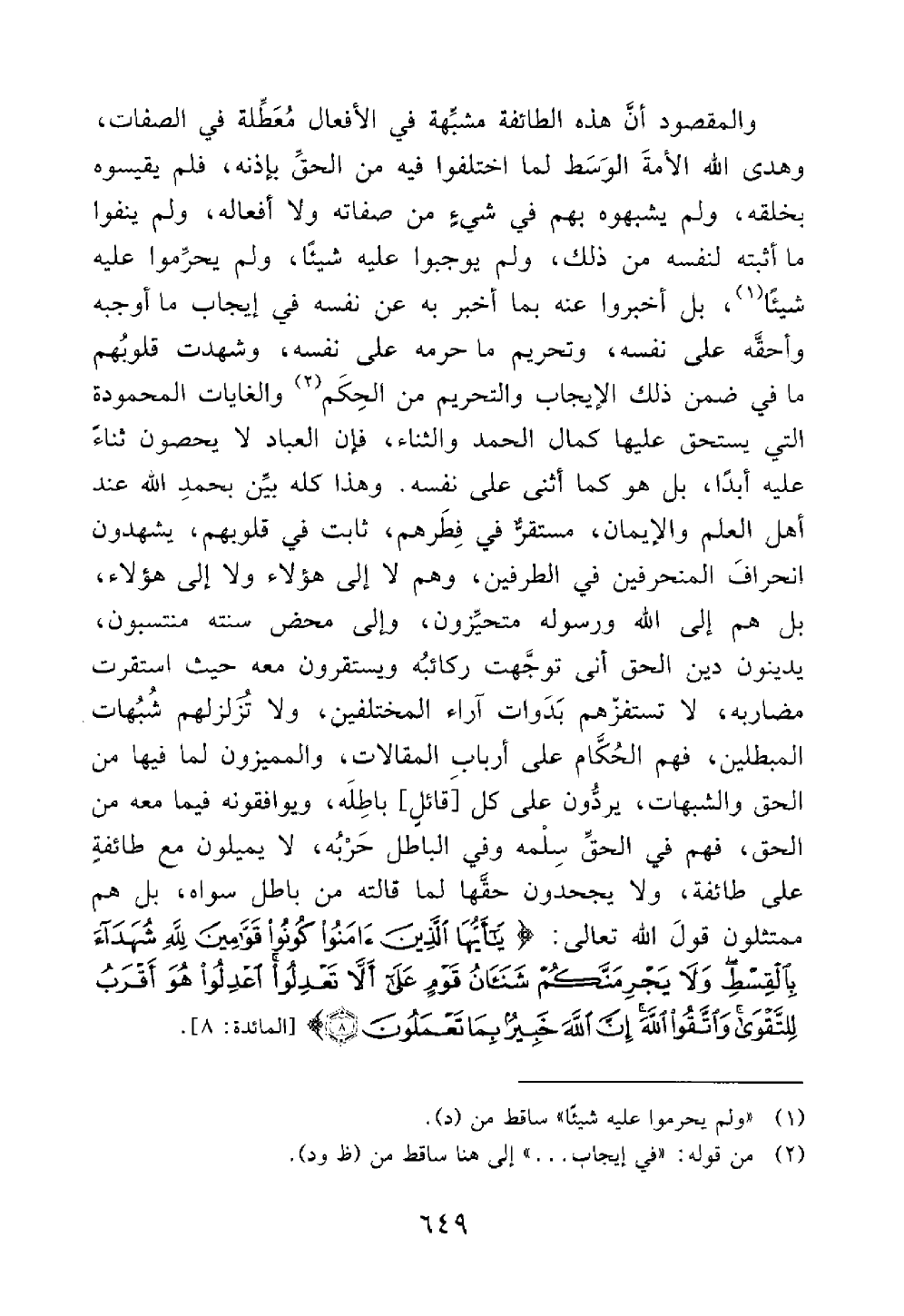 وهذا بين بحمد الله عند أهل العلم والإيمان مستقر في فطرهم ثابت في قلوبهم يشهدون انحراف المنحرفين في الطرفين وهم لا إلى هؤلاء ولا إلى هؤلاء بل هم إلى الله تعالى ورسوله متحيزون وإلى محض سنته منتسبون يدينون دين الحق أنى توجهت ركائبه ويستقرون معه حيث استقرت مضاربه لا تستفزهم بدوات آراء المختلفين ولا تزلزلهم شبهات المبطلين فهم الحكام على أرباب المقالات والمميزون لما فيها من الحق والشبهات يردون على كل باطلة ويوافقونه فيما معه في الحق فهم في الحق سلمه وفي الباطل حربه لا يميلون مع طائفة على طائفة ولا يجحدون حقها لما قالته من باطل سواه بل هم ممتثلون قول الله تعالى يا أيها الذين آمنوا كونوا قوامين لله شهداء بالقسط ولا يجرمنكم شنآن قوم على أن لا تعدلوا اعدلوا هو أقرب للتقوى واتقوا الله إن الله خبير بما تعملون المائدة 8 @