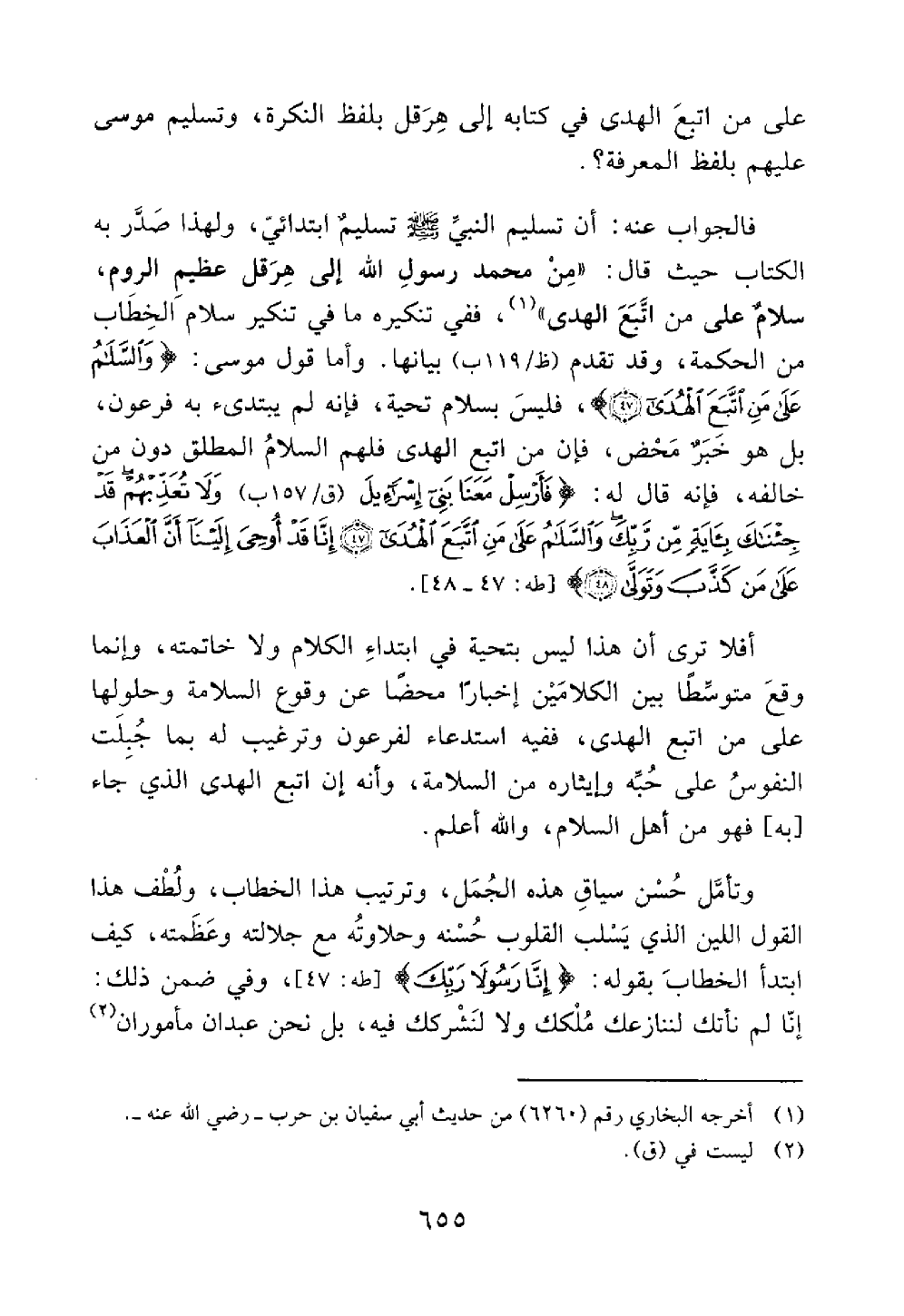 وأما قول موسى والسلام على من اتبع الهدى فليس بسلام تحية فإنه لم يبتديء به فرعون بل هو خبر محض فإن من اتبع الهدى له السلام المطلق دون من خالفه فإنه قال له فأرسل معنا بني إسرائيل ولا تعذبهم قد جئناك بآية من ربك والسلام على من اتبع الهدى إنا قد أوحي إلينا أن العذاب على من كذب وتولى طه 47 48