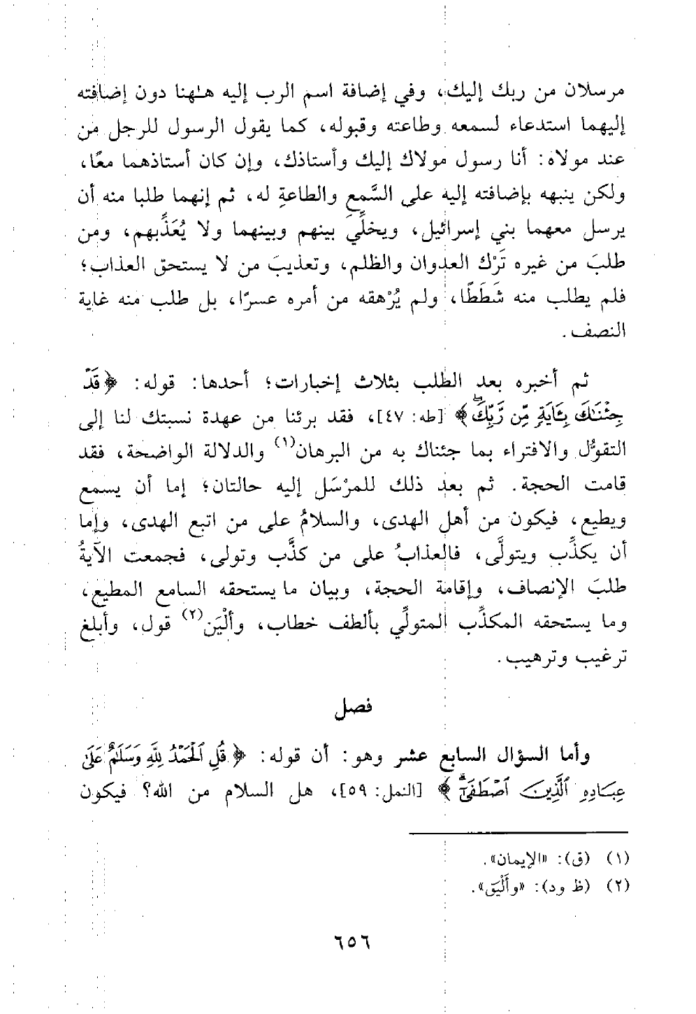 ثم أخبره بعد الطلب بثلاث إخبارات أحدها قوله تعالى قد جئناك بآية من ربك طه 47 فقد برئنا من عهدة نسبتك لنا إلى التقول والإفتراء بما جئناك به من البرهان والدلالة الواضحة فقد قامت الحجة ثم بعد ذلك للمرسل إليه حالتان إما أن يسمع ويطيع فيكون من أهل الهدى والسلام على من اتبع الهدى وإما أن يكذب ويتولى فالعذاب على من كذب وتولى فجمعت الآية طلب الإنصاف وإقامة الحجة وبيان ما يستحق السامع المطيع وما يستحقه المكذب المتولي بألطف خطاب وأليق قول وأبلغ ترغيب وترهيب