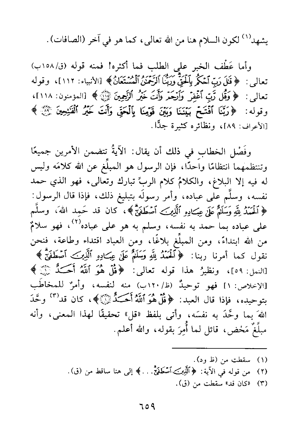 وفصل الخطاب في ذلك أن يقال الآية تتضمن الأمرين جميعا وتنتظمهما انتظاما واحدا فإن الرسول هو المبلغ عن الله كلامه وليس فيه إلا البلاغ والكلام كلام الرب تبارك وتعالى فهو الذي حمد نفسه وسلم على عباده وأمر رسوله بتبليغ ذلك فإذا قال الرسول الحمد لله وسلام على عباده الذي اصطفى كان قد حمد الله وسلم على عباده بما حمد به نفسه وسلم به هو على عباده فهو سلام من الله ابتداء ومن المبلغ بلاغا ومن العباد اقتداء وطاعة فنحن نقول كما أمرنا ربنا تبارك وتعالى الحمد لله وسلام على عباده الذين اصطفى
