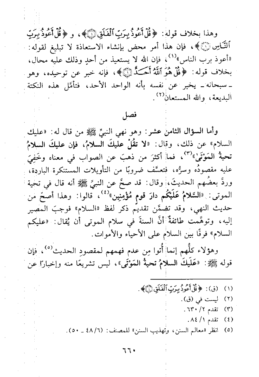 وأما السؤال الثامن عشر وهو نهى النبي من قال له عليك السلام عن ذلك وقال لا تقل عليك السلام فإن عليك السلام تحية الموتى فما أكثر من ذهب عن الصواب في معناه وخفي عليه مقصوده وسره فتعسف ضروبا من التأويلات المستنكرة الباردة ورد بعضهم الحديث وقال قد صح عن النبي أنه قال في تحية الموتى السلام عليكم دار قوم مؤمنين // رواه مسلم // قالوا وهذا أصح من حديث النهي وقد تضمن تقديم ذكر لفظ السلام فوجب المصير إليه
