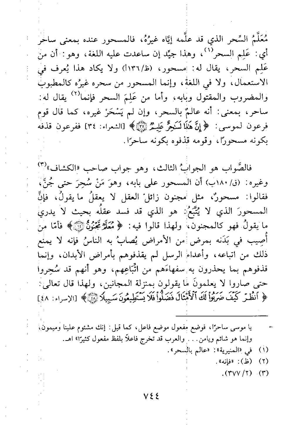 وأما من علم السحر فإنه يقال له ساحر بمعنى أنه عالم بالسحر وإن لم يسحره غيره كما قال قوم فرعون لموسى إن هذا لساحر عليم الشعراء 34 ففرعون قذفه بكونه مسحورا وقومه قذفوه بكونه ساحرا فالصواب هو الجواب الثالث وهو جواب صاحب الكشاف وغيره إن المسحور على بابه وهو من سحر حتى جن فقالوا مسحور مثل مجنون زائل العقل لا يعقل ما يقول فإن المسحور الذي لا يتبع هو الذي فسد عقله بحيث لا يدري ما يقول فهو كالمجنون ولهذا قالوا فيه معلم مجنون فأما من أصيب في بده بمرض من الأمراض يصاب به الناس فإنه لا يمنع ذلك من اتباعه وأعداء الرسل لم يقذفوهم بأمراض الأبدان وإنما قذفوهم بما يحذرون به سفهاءهم من اتباعهم وهو أنهم قد سحروا حتى صاروا لا يعلمون ما يقولون بمنزلة المجانين ولهذا قال تعالى انظر كيف ضربوا لك الأمثال فضلوا فلا يستطيعون سبيلا الإسراء 48 @