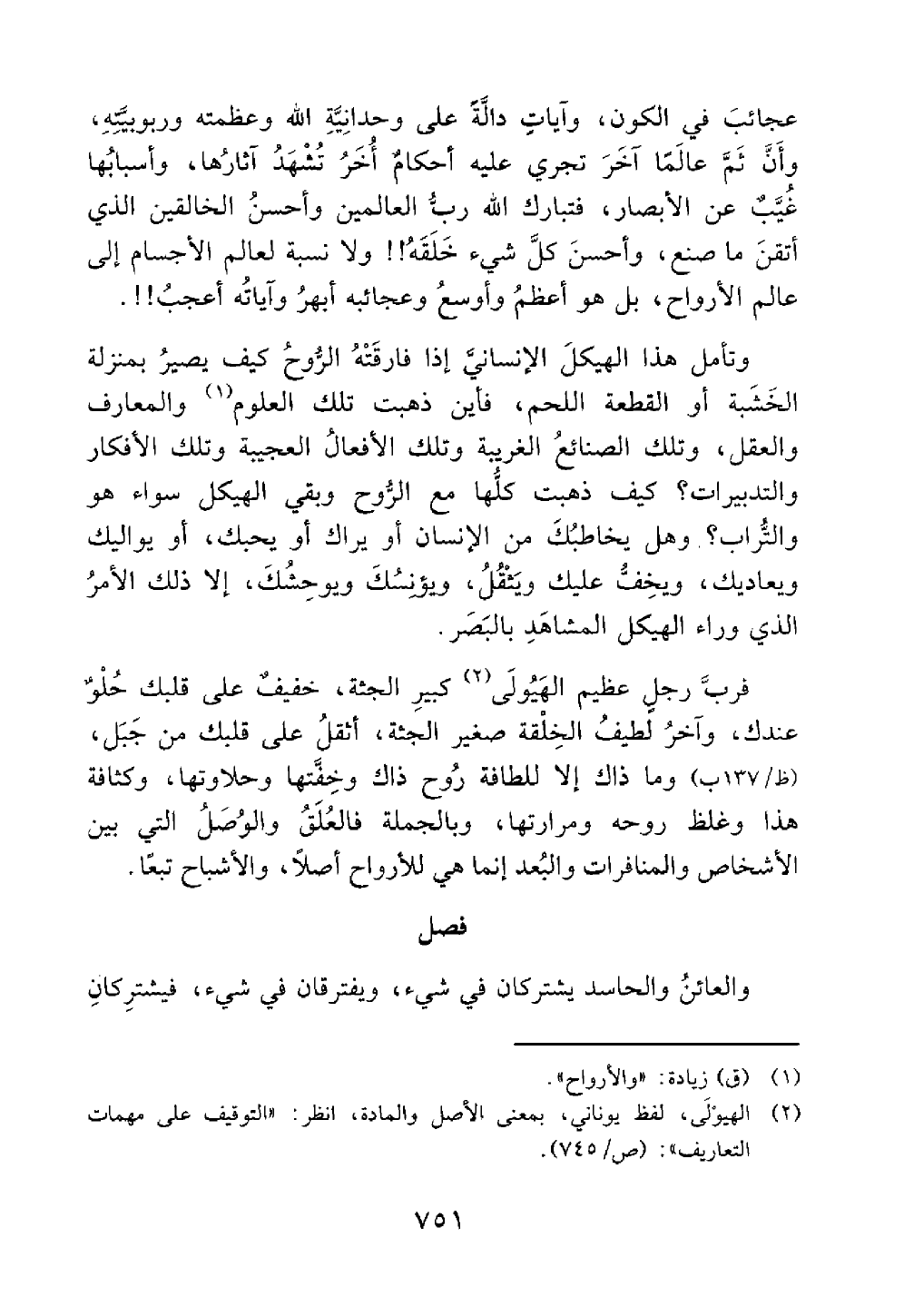 وتأمل هذا الهيكل الإنساني إذا فارقته الروح كيف يصير بمنزلة الخشبة أو القطعة من اللحم فأين ذهبت تلك العلوم والمعارف والعقل وتلك الصنائع الغريبة وتلك الأفعال العجيبة وتلك الأفكار والتدبيرات كيف ذهبت كلها مع الروح وبقي الهيكل سواء هو والتراب وهل يخاطبك من الإنسان أو يراك أو يحبك أو يواليك أو يعاديك ويخف عليك ويثقل ويؤنسك ويوحشك إلا ذلك الأمر الذي وراء الهيكل المشاهد بالبصر
