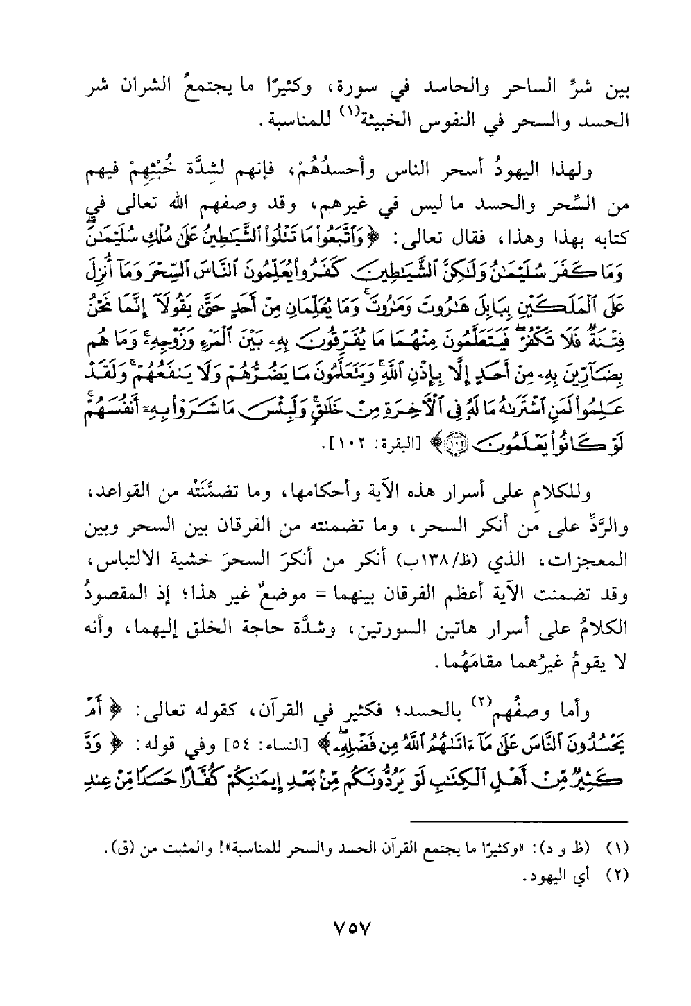 والكلام على أسرار هذه الآية وأحكامها وما تضمنته من القواعد والرد على من أنكر السحر وما تضمنته من الفرقان بين السحر وبين المعجزات الذي أنكره من أنكر السحر خشية الإلتباس وقد تضمنت الآية أعظم الفرقان بينهما في موضع غير هذا إذ المقصود الكلام على أسرار هاتين السورتين وشدة حاجة الخلق إليهما وإن لا يقوم غيرهما مقامهما وأما وصفهم بالحسد فكثير في القرآن كقوله تعالى أم يحسدون الناس على ما آتاهم الله من فضله النساء 54 وفي قوله ود كثير من أهل الكتاب لو يردونكم من بعد إيمانكم كفارا حسدا من عند@