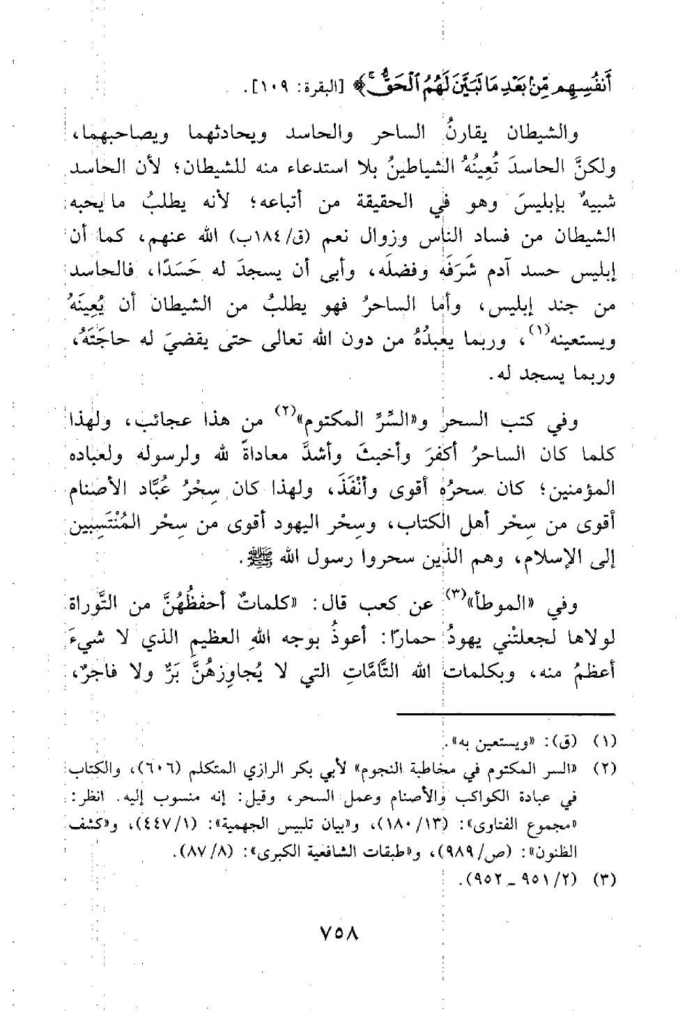 والشيطان يقارن الساحر والحاسد ويحادثهما ويصاحبها ولكن الحاسد تعينه الشياطين بلا استدعاء منه للشيطان لأن الحاسد شبيه بإبليس وهو في الحقيقة من أتباعه لأنه