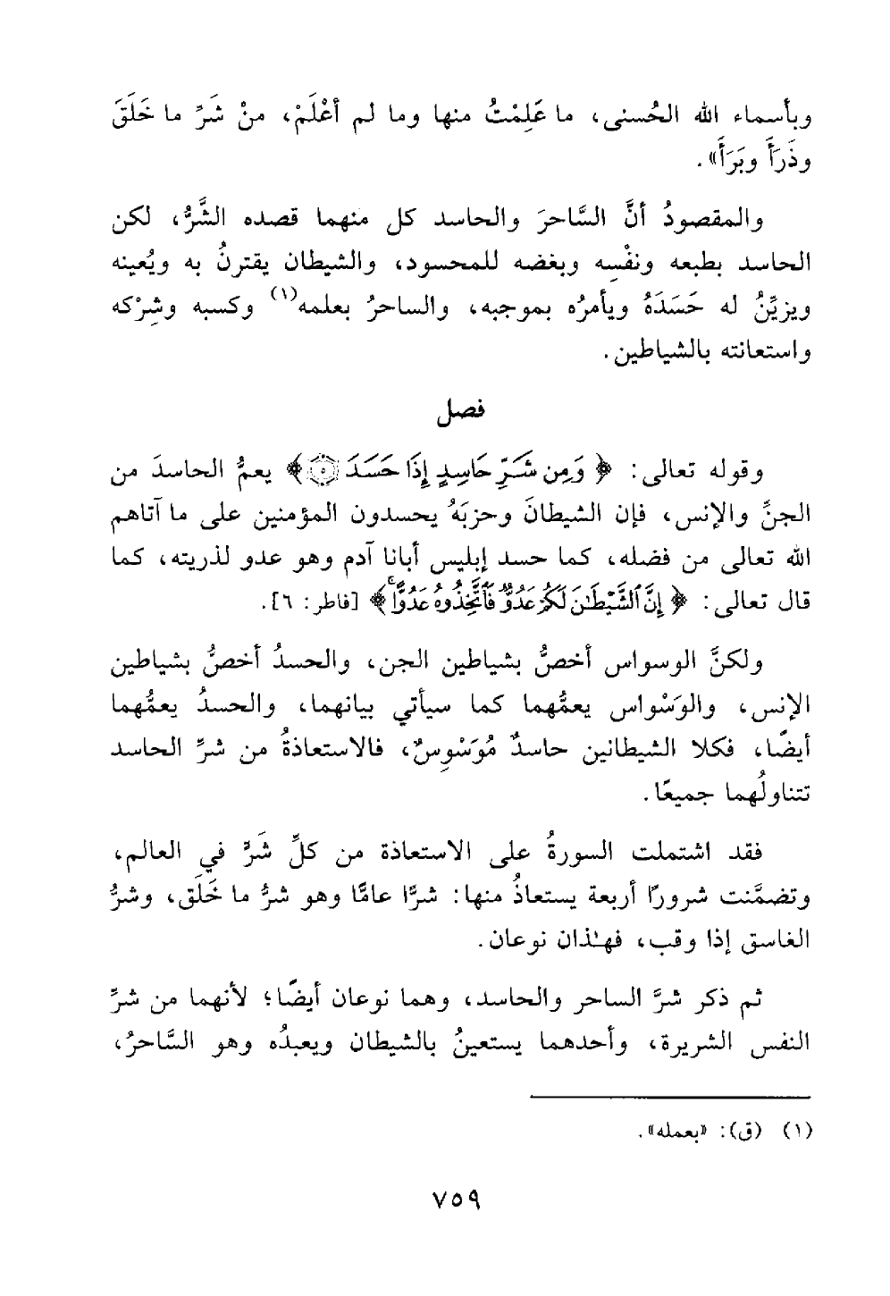 والمقصود أن الساحر والحاسد كل منهما قصده الشر لكن الحاسد بطبعه ونفسه وبغضه للمحسود والشيطان يقترن به ويعينه ويزين له حسده ويأمره بموجبه والساحر بعلمه وكسبه وشركه واستعانته بالشياطين فصل الحسد يشمل الحاسد من الجن والإنس