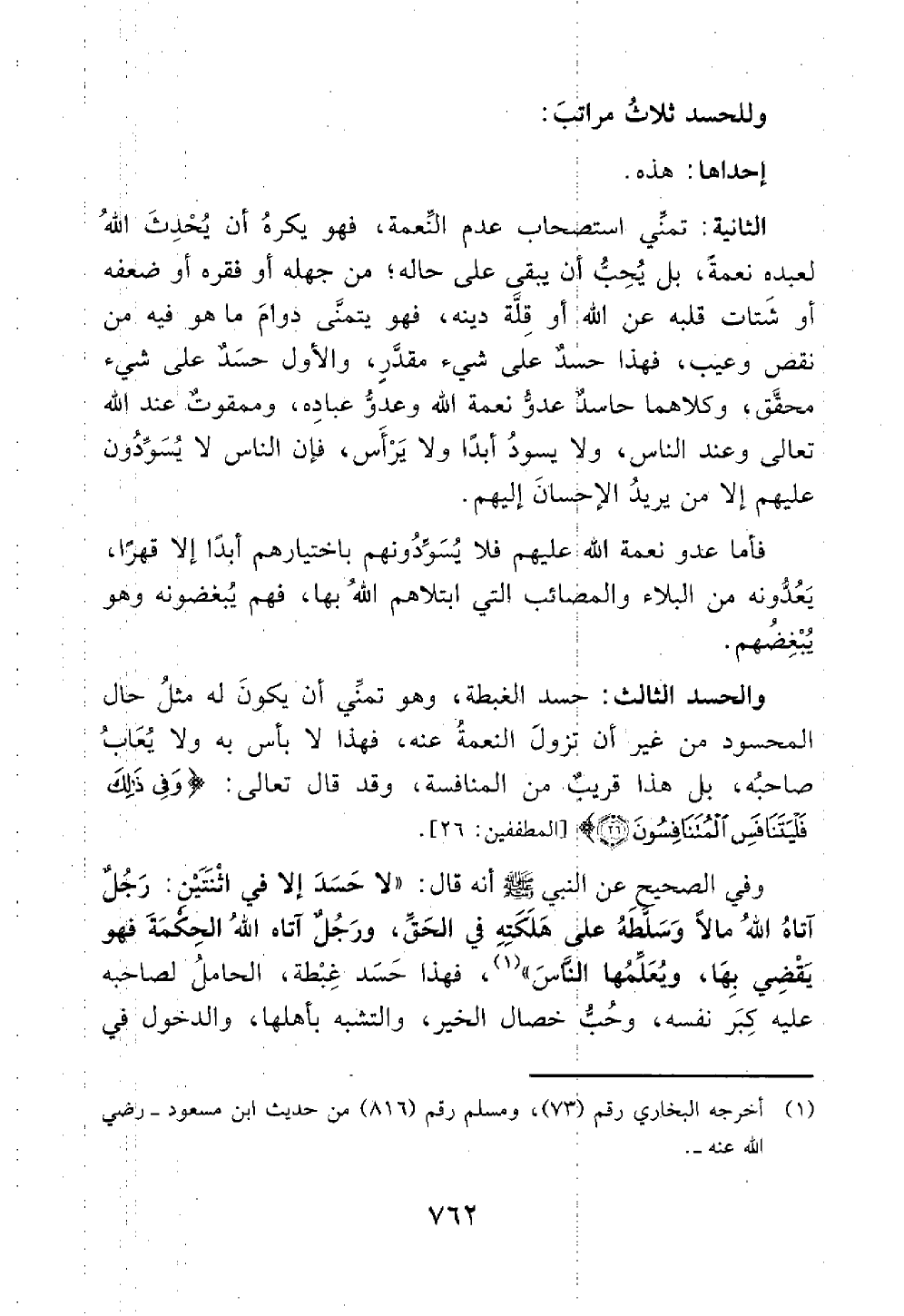 والحسد الثالث حسد الغبطة وهو تمني أن يكون له مثل حال المحسود من غير أن تزول النعمة عنه فهذا لا بأس به ولا يعاب صاحبه بل هذا قريب من المنافسة وقد قال تعالى وفي ذلك فليتنافس المتنافسون خطأ يبحثها المحقق وفي الصحيح عن النبي أنه قال لا حسد إلا في اثنتين رجل آتاه الله مالا وسلطه على هلكته في الحق ورجل آتاه الله الحكمة فهو يقضي بها ويعلمها الناس // رواه البخاري ومسلم // فهذا حسد غبطة الحامل لصاحبه عليه كبر نفسه وحب خصال الخير والتشبه بأهلها والدخول في @