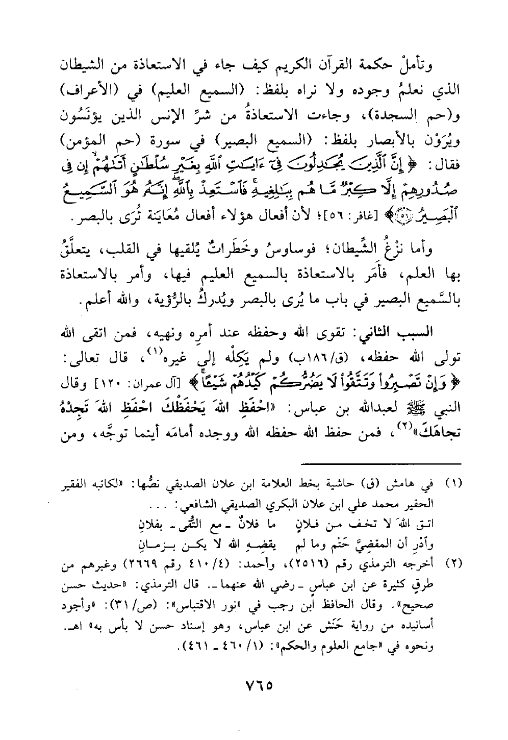 وتأمل حكمة القرآن الكريم كيف جاء في الإستعاذة من الشيطان الذي نعلم وجوده ولا نراه بلفظ السميع العليم في الأعراف والسجدة وجاءت الإستعاذة من شر