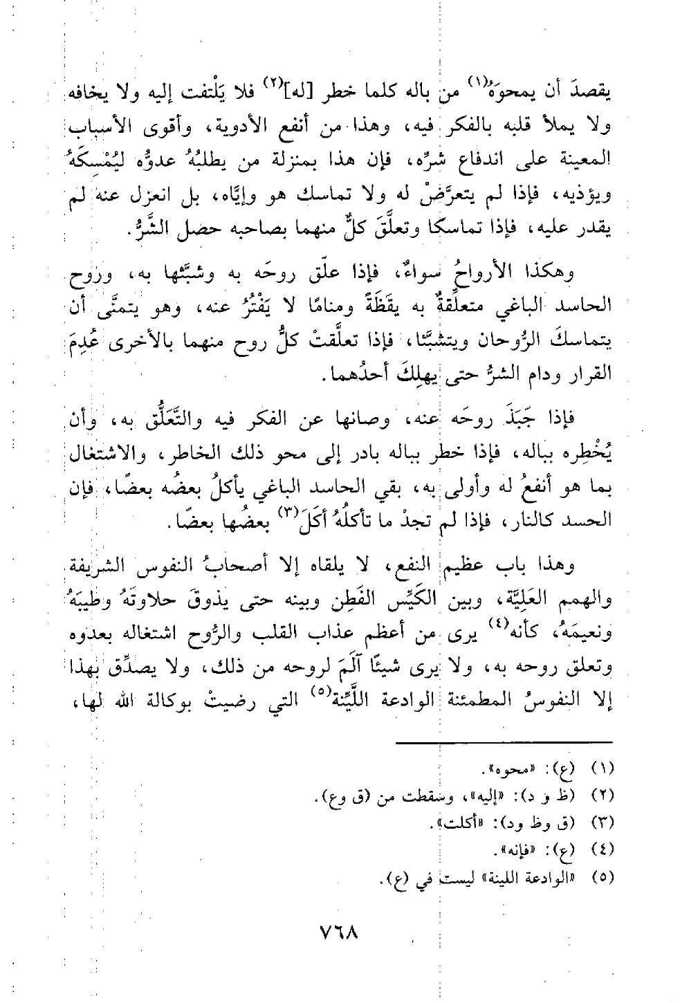 وهكذا الأرواح سواء فإذا علق روحه وشبثها به وروح الحاسد الباغي متعلقة به يقظة ومناما لا يفتر عنه وهو يتمنى أن يتماسك الروحان ويتشبثا فإذا تعلقت كل روح منهما بالأخرى عدم القرار ودام الشر حتى يهلك أحدهما