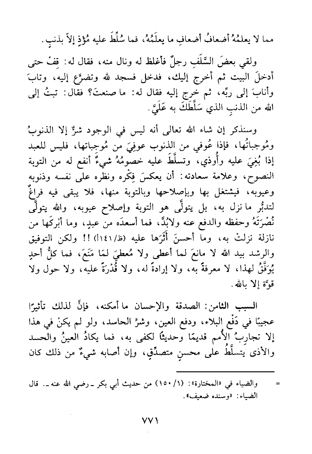 السبب الثامن الصدقة والإحسان ما أمكنه فإن لذلك تأثيرا عجيبا في دفع البلاء ودفع العين وشر الحاسد ولو لم يكن في هذا إلا تجارب الأمم قديما وحديثا لكفى به فما يكاد العين والحسد والأذى يتسلط على محسن متصدق وإن أصابه شيء من ذلك كان @
