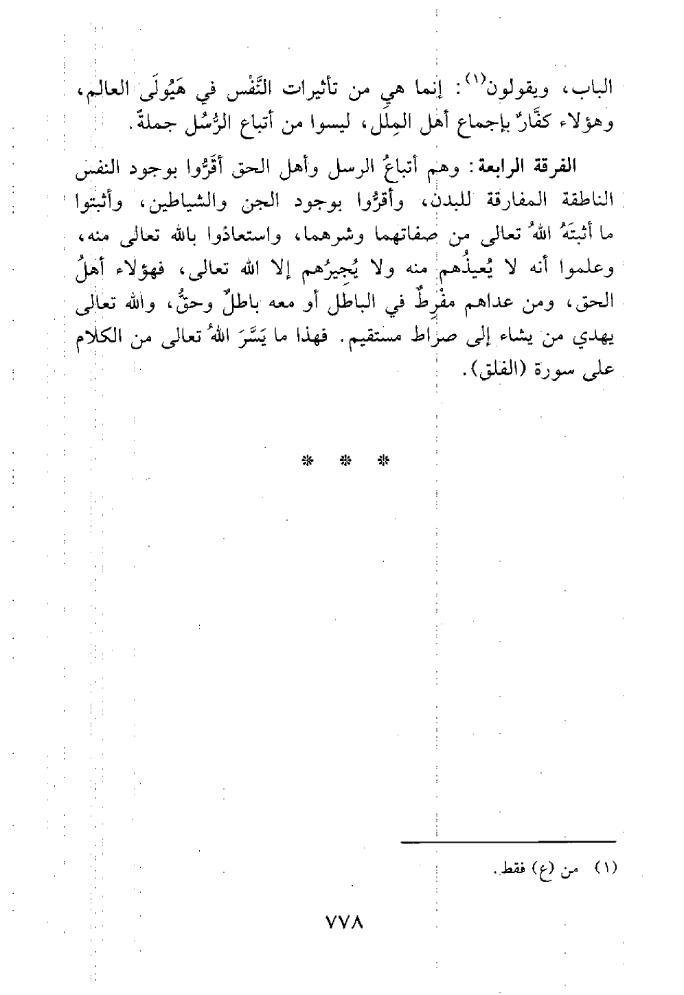 الفرقة الرابعة وهم أتباع الرسل وأهل الحق أقروا بوجود النفس الناطقة المفارقة للبدن وأقروا بوجود الجن والشياطين وأثبتوا ما أثبته الله تعالى من صفاتهما وشرهما واستعاذوا بالله تعالى منه وعلموا أنه لا يعيذهم منه ولا يجيرهم إلا الله تعالى فهؤلاء أهل الحق ومن عداهم مفرط في الباطل أو معه باطل وحق الله تعالى يهدي من يشاء إلى صراط مستقيم فهذا ما يسر الله تعالى من الكلام على سورة الفلق@
