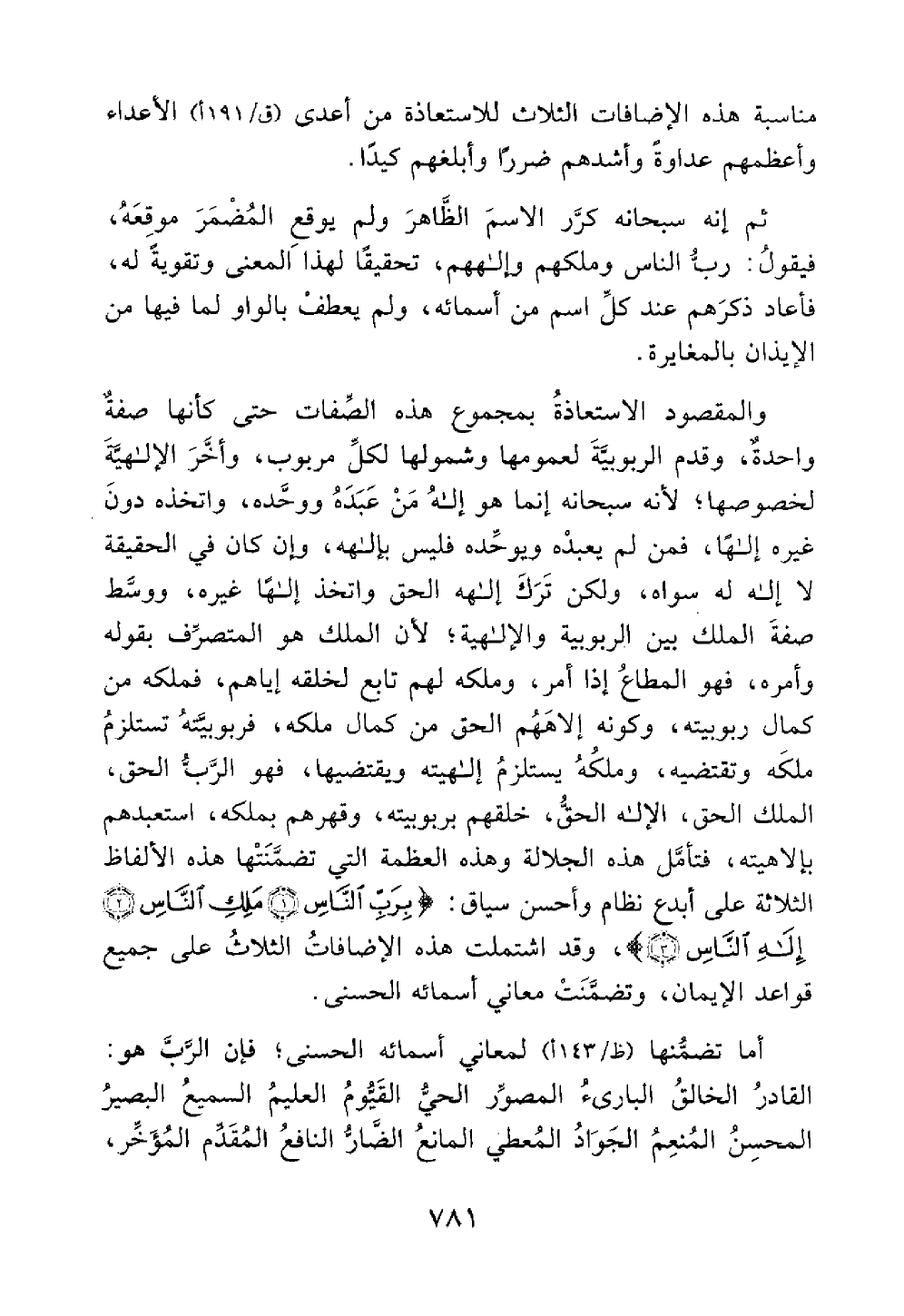 الربوبية والإلهية لأن الملك هو المتصرف بقوله وأمره فهو المطاع إذا أمر وملكه لهم تابع لخلقه إياهم فملكه من كمال ربوبيته وكونه إلاههم الحق من كمال ملكه فربوبيته تستلزم ملكه وتقتضيه وملكه يستلزم إلهيته ويقتضيها فهو الرب الحق الملك الحق الإله الحق خلقهم بربوبيته وقهرهم بملكه استعبدهم بإلاهيته فتأمل هذه الجلالة وهذه العظمة التي تضمنته هذه الألفاظ الثلاثة على أبدع نظام وأحسن سياق رب الناس ملك الناس إله الناس وقد اشتملت هذه الإضافات الثلاث على جميع قواعد الإيمان وتضمنت معاني أسمائه الحسنى