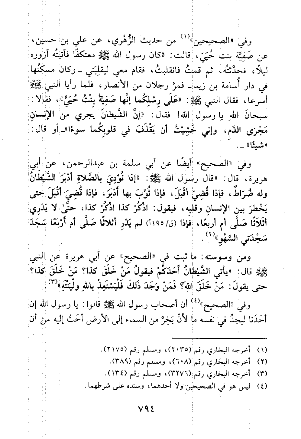 وفي الصحيحين من حديث الزهري عن علي بن حسين عن صفية بنت حيي قالت كان رسول الله معتكفا فأتيته أزوره ليلا فحدثته ثم قمت فانقلبت فقام معي ليقلبني وكان مسكنها في دار أسامة بن زيد فمر رجلان من الأنصار فلما رأيا النبي أسرعا فقال النبي على رسلكما إنها صفية بنت حيي فقالا سبحان الله يا رسول الله فقال إن الشيطان يجري من الإنسان مجرى الدم وإني خشيت أن يقذف في قلوبكما سوءا أو قال شيئا // رواه البخاري //