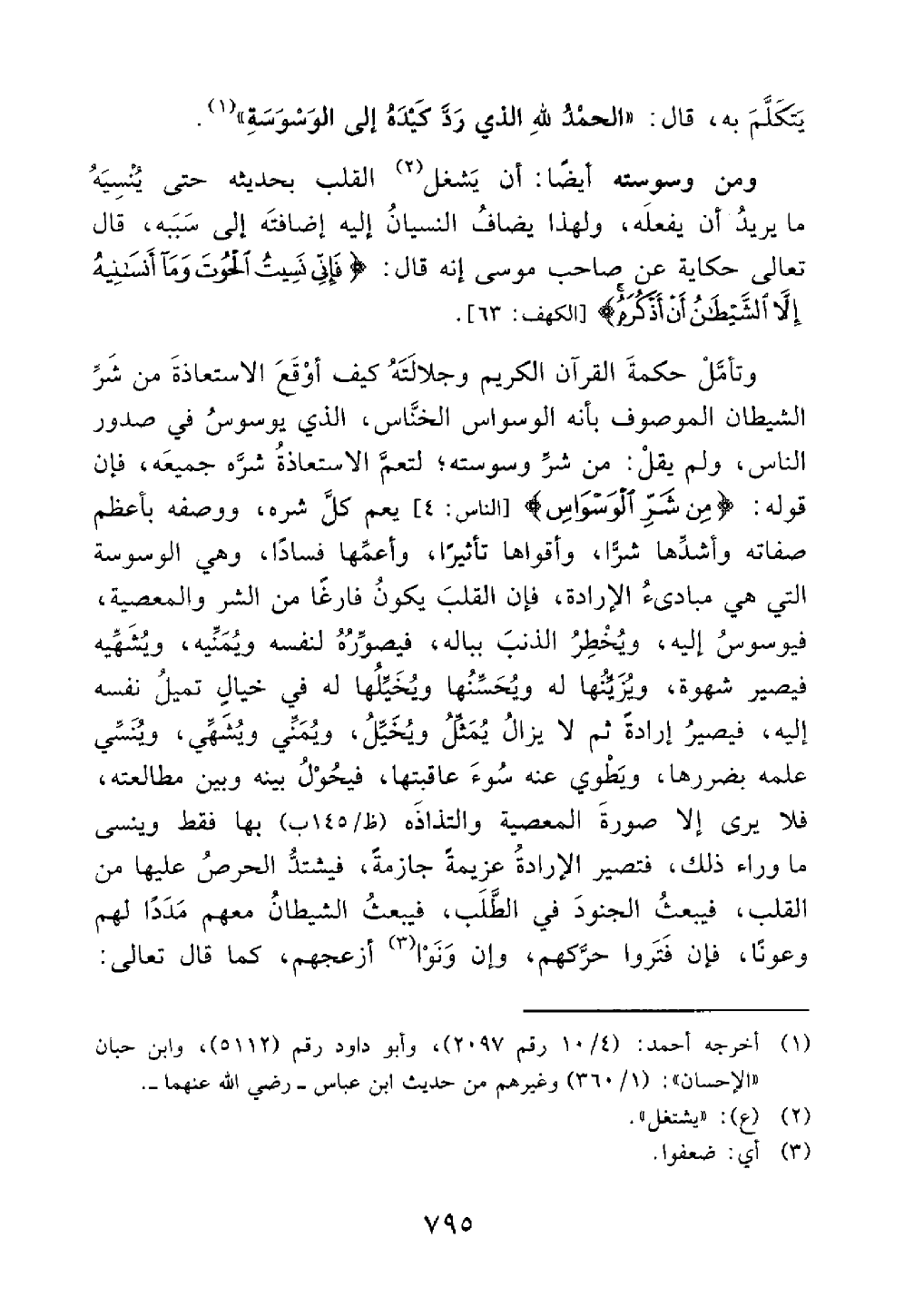 وتأمل حكمة القرآن الكريم وجلالته كيف أوقع الإستعاذة من شر الشيطان الموصوف بأنه الوسواس الخناس الذي يوسوس في صدور الناس ولم يقل من شر وسوسته لتعم الإستعاذة شره جميعه فإن قوله من شر الوسواس الناس 4 يعم كل شره ووصفه بأعظم صفاته وأشدها شرا وأقواها تأثيرا وأعمها فسادا وهي الوسوسة التي هي مباديء الإرادة فإن القلب يكون فارغا من الشر والمعصية فيوسوس إليه ويخطر الذنب بباله فيصوره لنفسه ويمنيه ويشهيه فيصير شهوة ويزينها له ويحسنها ويخيلها له في خيال تميل نفسه إليه فيصير إرادة ثم لا يزال يمثل ويخيل ويمني ويشهي وينسى علمه بضررها ويطوي عنه سوء عاقبتها فيحول بينه وبين مطالعته فلا يرى إلا صورة المعصية والتذاذه بها فقط وينسى ما وراء ذلك فتصبر الإرادة عزيمة جازمة فيشتد الحرص عليها من القلب فيبعث الجنود في الطلب فيبعث الشيطان معهم مدادا لهم وعونا فإن فتروا حركهم وإن ونوا أزعجهم كما قال تعالى@