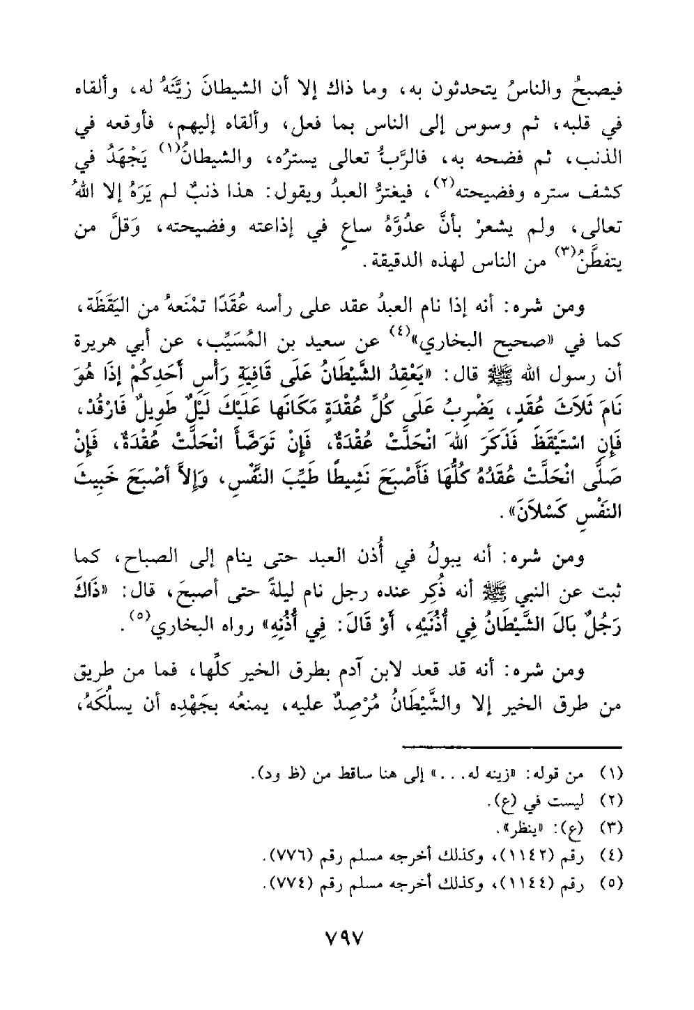 فيصبح والناس يتحدثون به وما ذاك إلا أن الشيطان زينه له وألقاه في قلبه ثم وسوس إلى الناس بما فعل وألقاه فأوقعه في الذنب ثم فضحه به فالرب تعالى يستره والشيطان يجهد في كشف ستره وفضيحته فيغتر العبد ويقول هذا ذنب لم يره إلا الله تعالى ولم يشعر بأن عدوه ساع في إذاعته وفضيحته وقل من يتفطن من الناس لهذه الدقيقة ومن شره أنه إذا نام العبد عقد على رأسه عقدا تمنعه من اليقظة كما في صحيح البخاري عن سعيد بن المسيب عن أبي هريرة أن رسول الله قال ويعقد الشيطان على قافية رأس أحدكم إذا هو نام ثلاث عقدة يضرب على كل عقدة مكانها عليك ليل طويل فارقد فإن استيقظ فذكر الله انحلت عقده فإن توضأ انحلت عقدة فإن صلى انحلت عقدة كلها فأصبح نشيطا طيب النفس وإلا أصبح خبيث النفس كسلان // رواه البخاري ومسلم //