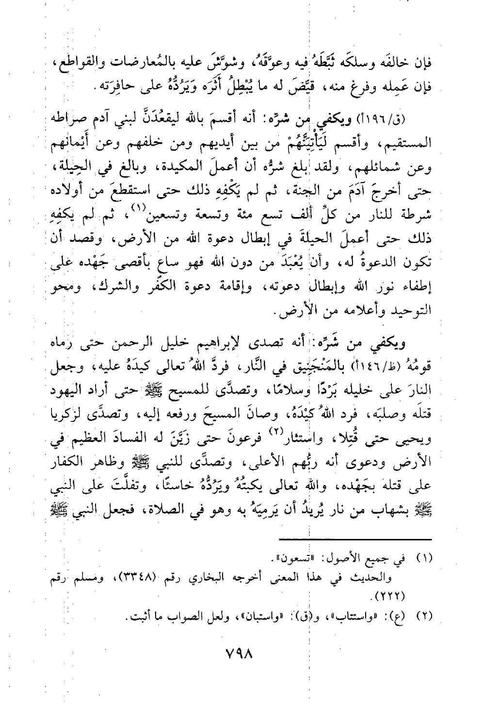 ويكفي من شره أنه تصدى لإبراهيم خليل الرحمن حتى رماه قومه بالمنجنيق في النار فرد الله تعالى كيده عليه وجعل النار على خليله بردا وسلاما وتصدى حتى أراد اليهود قتله وصلبه فرد الله كيده وصان المسيح ورفعه إليه وتصدى لزكريا ويحيى حتى قتلا واستثار فرعون حتى زين له الفساد العظيم في الأرض ودعوى أنه ربهم الأعلى وتصدى للنبي وظاهر الكفار على قتله بجهده والله تعالى يكبته ويرده خاسئا وتفلت على النبي بشهاب من نار يريد أن يرميه به وهو في الصلاة فجعل النبي صلى الله عليه وسلم @